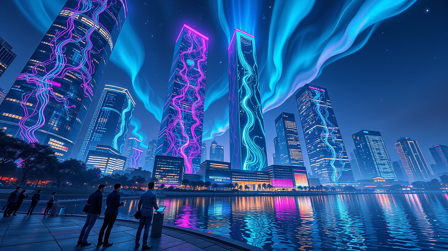 作图提示词:A dramatic upward view of Hefei’s government district, where skyscraper facades transform into giant spectral displays visualizing real-time urban data as flowing auroras. Office workers by the lakeside use gesture controls to manipulate floating data particles, collaboratively solving governance challenges. Lighting: neon data streams reflecting on water surfaces with atmospheric glow. Composition: extreme vertical perspective emphasizing the buildings’ height, captured with a wide-angle lens to include both the towering structures and human interactions. Color palette: deep indigo night sky with vibrant electric blues, purples and pinks in the data visualizations.