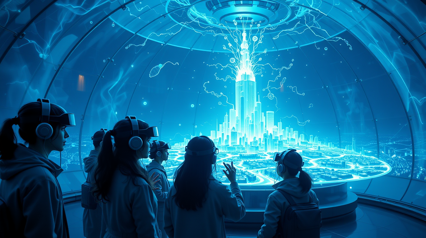 作图提示词:A mesmerizing interior view of Dongpu Island’s transparent containment dome, where a state-of-the-art nuclear fusion device generates mesmerizing plasma flows resembling a luminous ballet. Young researchers wearing neural interface headsets collaboratively manipulate holographic city models mid-air, causing the plasma to morph into a detailed 3D terrain map of Hefei. Lighting: cool futuristic blue glow with intense plasma highlights. Composition: medium shot with shallow depth-of-field focusing on both the researchers’ intense expressions and the dynamic plasma formations, captured with high-speed photography to freeze the plasma movements.