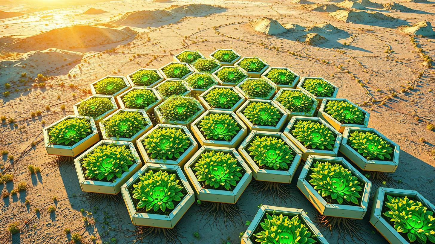 作图提示词:Aerial view of a futuristic hexagonal cultivation pod matrix on reclaimed saline-alkali land, each pod glowing with bioluminescent plant life, roots visibly interconnected with underground quantum computing networks. The hive-like agricultural facility exhibits geometric precision under warm golden sunlight casting long shadows, featuring a vibrant green and gold color palette. Sci-fi agricultural aesthetic with clean lines, organic shapes, and ultra-detailed textures blending advanced technology with thriving vegetation, embodying a 22nd-century sustainable farming vision.