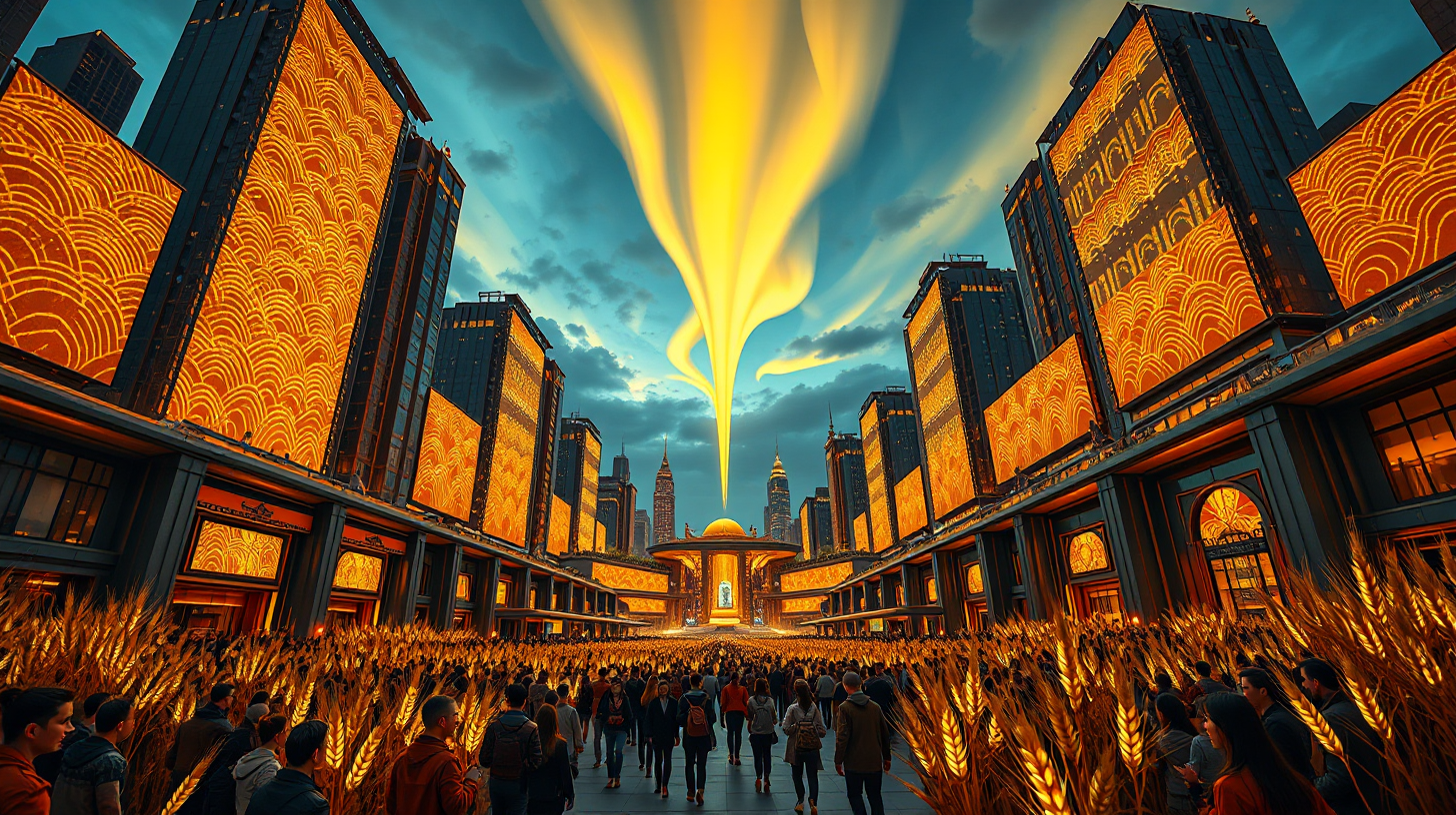 作图提示词:Low-angle shot of a breathtaking futuristic cityscape at dusk, where skyscrapers project synchronized wheat field wave patterns across their surfaces. Crowds holding bioluminescent wheat stalks move toward the central plaza as a golden aurora bursts in the darkening sky, generated by collective brainwave harmony. The scene features a warm amber and electric gold color scheme, with futuristic-traditional fusion architecture inspired by ancient bronze artifacts. Ultra-wide perspective captures both the monumental urban environment and cosmic light display, with highly detailed textures showcasing advanced projection technology and organic light sources, representing a 22nd-century harmonious blend of technology and tradition.