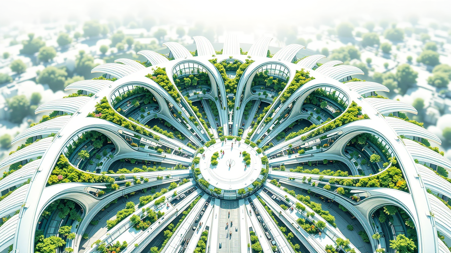 作图提示词:A wheat ear-shaped maglev transit hub in Zhumadian, composed of transparent ecological capsules with integrated greenery. High aerial perspective showing radial symmetry, clean white and green color palette with glass reflections, sharp focus throughout for technical clarity, and balanced artificial/natural lighting. Sustainable urban mobility design reflecting 2030s transportation concepts.