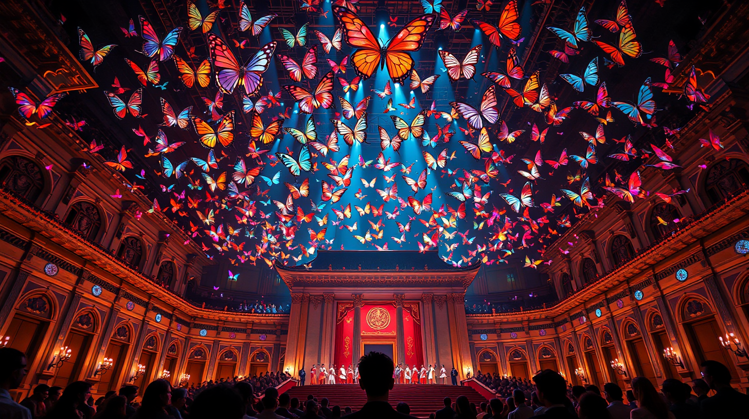 描述:古典戏曲学院的上空,一群由可编程物质构成的蝴蝶群轻盈飞舞,它们如同有生命的光粒子,根据观众的情绪光谱不断变换着队形,演绎着一场场动态的视觉盛宴。舞台上,演员们身着特殊服饰,他们的神经脉冲通过服饰转化为可见的情感光纹,与建筑立面的动态语义浮雕相互共鸣,让抽象的情感化作具象的光影,在科技与艺术的碰撞中,重新诠释着传统戏曲的魅力。