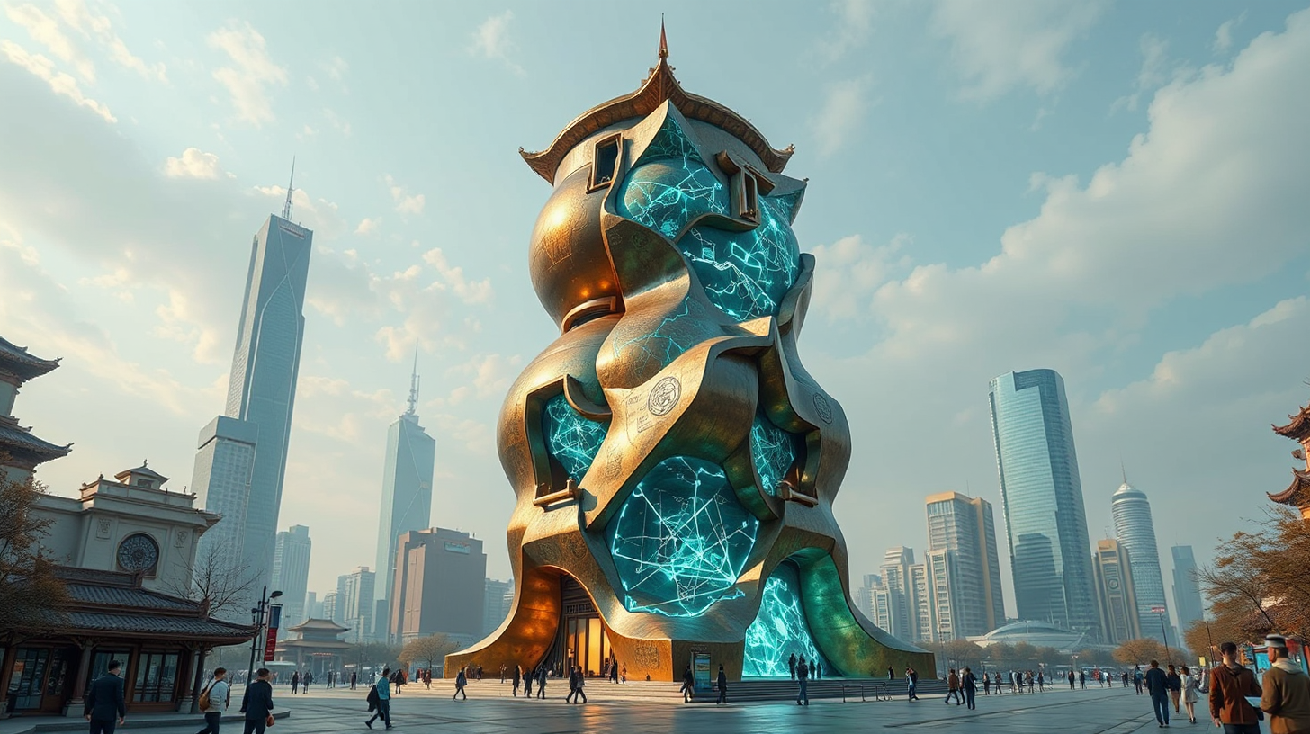 描述:城市中心,一座可变形拓扑结构的青铜器造型塔楼拔地而起,其表面如流动的时光,不断变幻着古代驿站路线图的全息投影。青铜的古朴与光影的灵动在此交织,营造出一种跨越千年的神秘感。地基处,考古纳米机器人如勤劳的工蚁不断涌出,小心翼翼地修复着新发现的汉代简牍,并将其即时转化为三维影像,让历史的碎片在科技的照耀下重焕生机。
