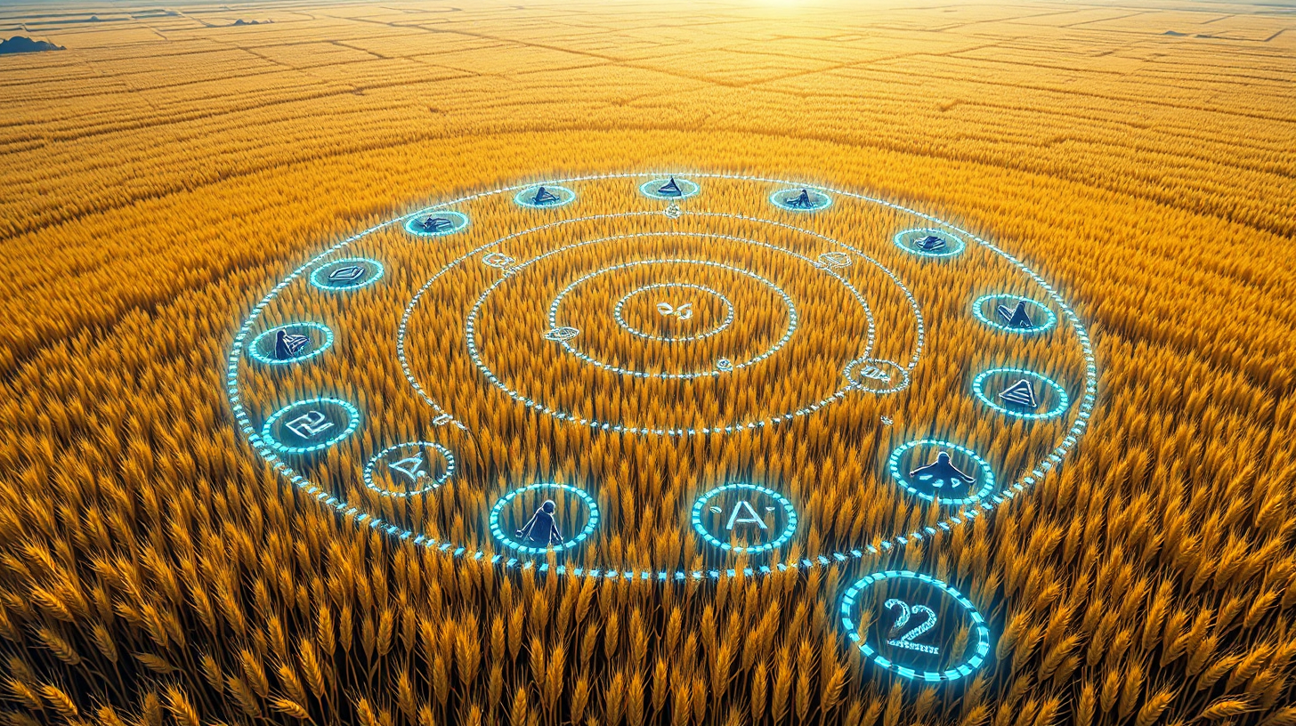 作图提示词:A stunning overhead view of golden wheat fields forming a living matrix, with countless nanorobots creating glowing patterns of traditional farming proverbs about the 24 solar terms. The scene combines agricultural beauty with high-tech elements, warm golden tones with electric blue accents, ultra-detailed, photorealistic style with a touch of surreal glow, illustrating the harmony between technology and ancient farming wisdom in Hebi.