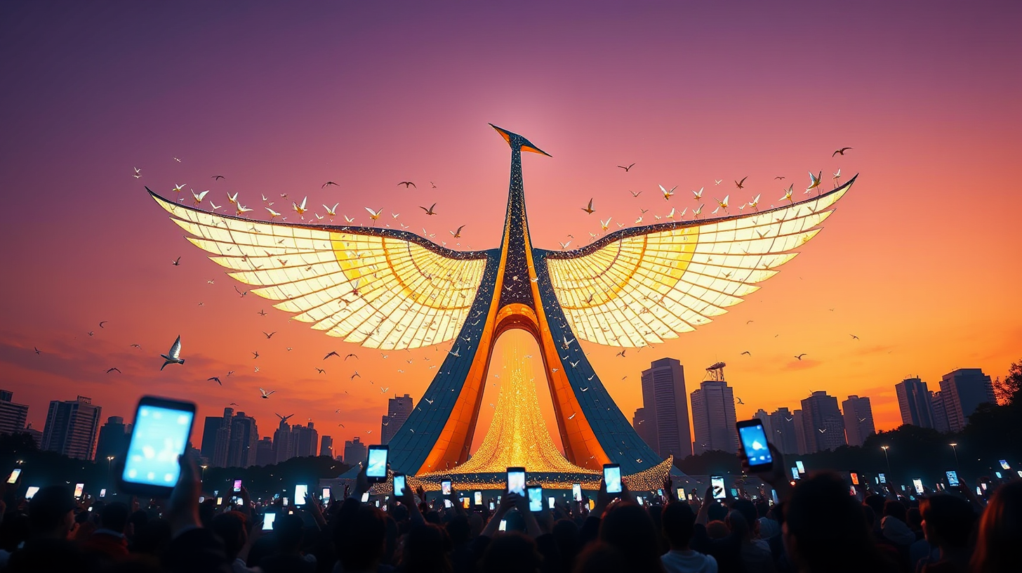 作图提示词:The majestic ‘Crane Dance’ city landmark at golden hour, its photon wings unfolding as thousands of holographic cranes ascend toward space. Citizens below raise smart devices emitting streams of luminous data. Warm golden and white light contrasts with deep purple twilight, captured in an extreme wide shot from low angle. Shallow depth of field focuses on the sculpture’s wing details while maintaining background context. High dynamic range lighting balances artificial and natural light sources, creating a sense of technological wonder and collective hope.