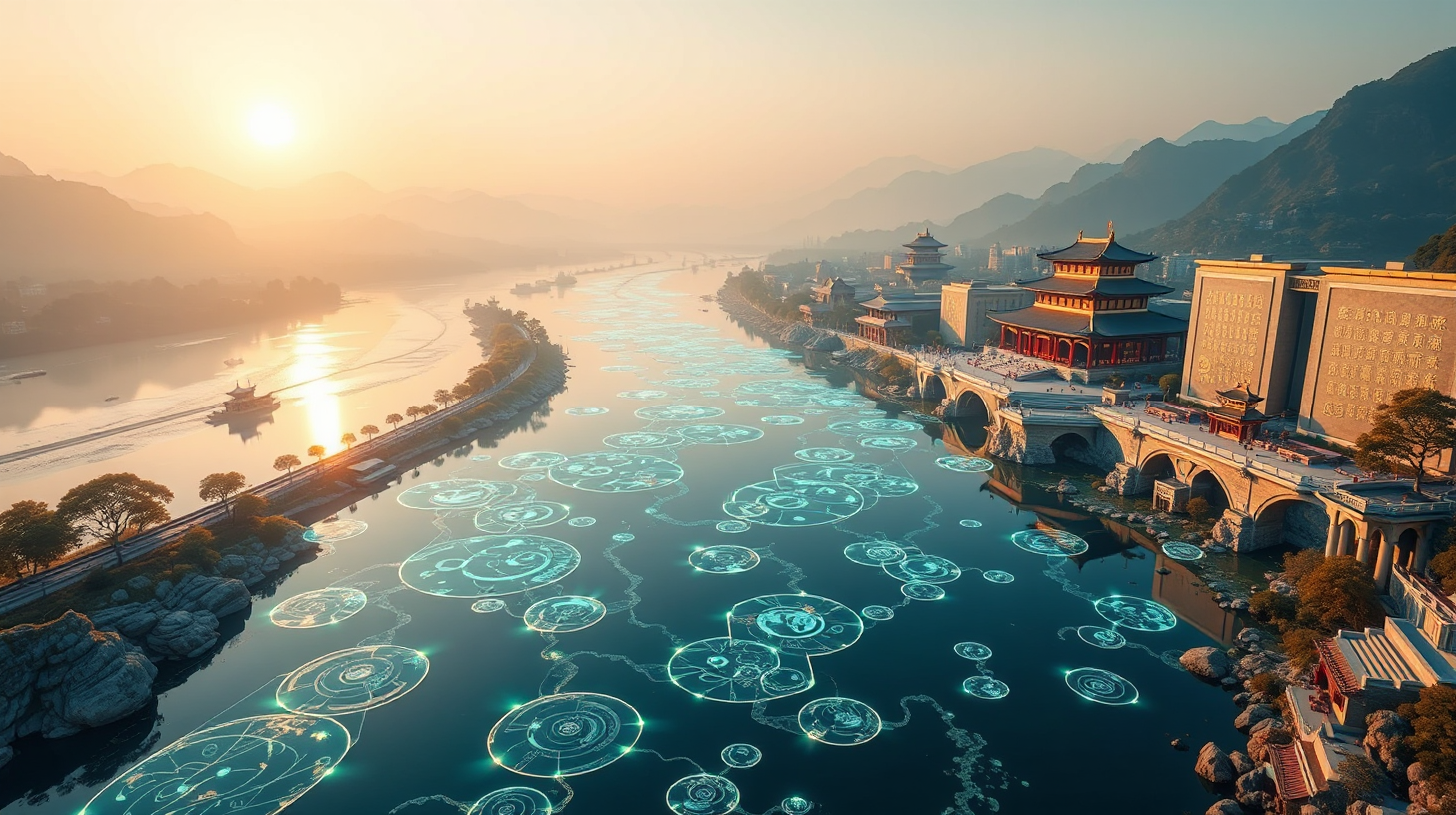作图提示词:A breathtaking aerial view of Qi River at dawn, with quantum light patterns shimmering on the water surface, merging seamlessly with holographic reliefs of ancient Chinese poetry from ‘The Book of Songs’ along the riverbanks. The scene is bathed in soft golden morning light, with futuristic architecture reflecting in the water. Ethereal atmosphere, ultra-detailed, cinematic lighting, vibrant colors with cyan and gold tones, digital painting style, capturing the fusion of ancient culture and future technology in Hebi, Henan.