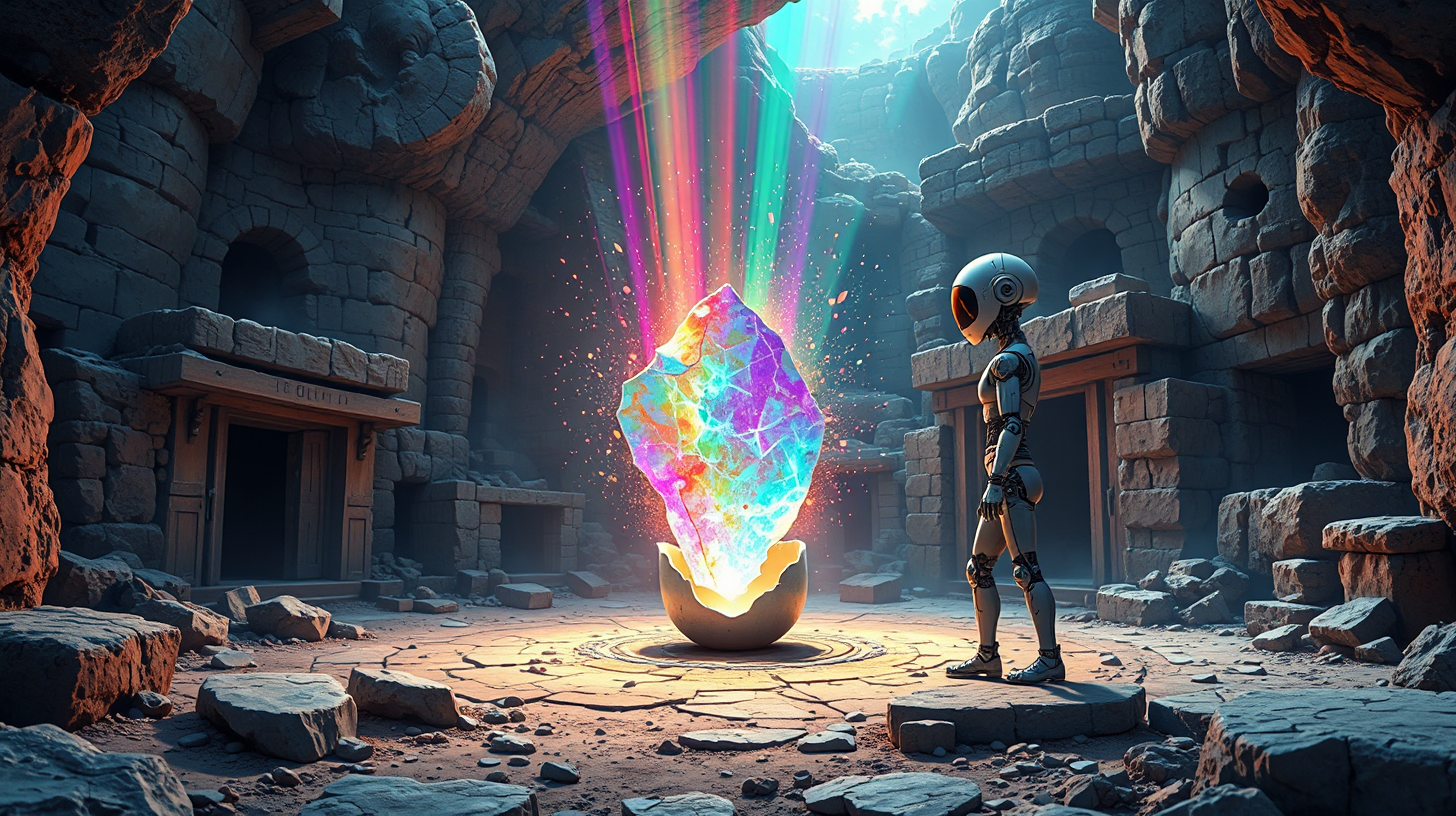 作图提示词:A mesmerizing mid-shot of ancient kiln ruins with a quantum restoration field, where an archaeological robot projects rainbow-hued holograms of Song Dynasty Jun porcelain techniques. A damaged ceramic shard suddenly erupts with prismatic light, illuminating the underground ceramic gene bank holograms. Ultra-detailed textures, mystical lighting with rainbow flares, fusion of archeology and quantum tech, cinematic composition, depicting the revival of ancient craftsmanship through futuristic technology in Hebi.