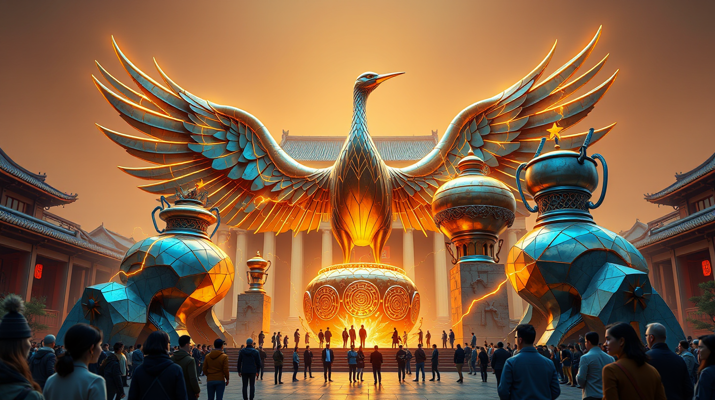 作图提示词:A dynamic mid-shot of morphing topological sculptures in Yunmeng Square, transitioning between a crane spreading its wings and ancient bronze ritual vessels from ‘The Investiture of the Gods’. The sculptures glow with golden energy lines, surrounded by awestruck citizens. Highly detailed metallic textures, warm bronze and cool blue color scheme, dramatic lighting emphasizing the transformation moment, cyberpunk meets traditional Chinese aesthetic, showcasing the blend of history and futuristic design in Hebi.