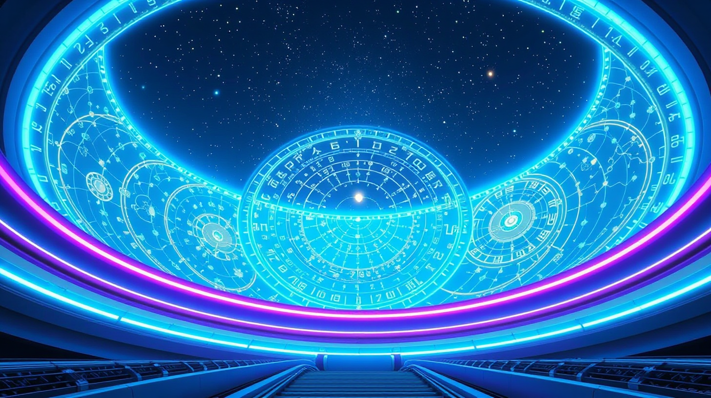 作图提示词:A breathtaking 360-degree circular maglev track glowing with dynamic Shang Dynasty star map totems, constellations forming intricate celestial patterns against a dark sky, viewed from a low-angle perspective to emphasize grandeur. Vibrant neon blues and purples highlight the designs, blending futuristic technology with ancient symbolism. Ultra-wide shot with deep depth of field, cinematic lighting with high contrast between illuminated track and starry sky, cool color palette accented by warm constellation glow.