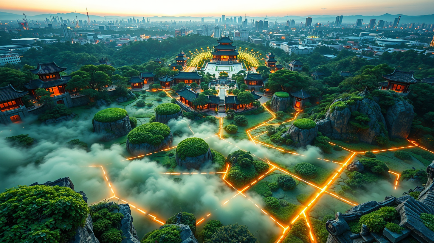 作图提示词:A majestic aerial panorama of Liuyuan Garden’s classical rockeries emitting clouds of glowing quantum moss particles, while pulsating golden light patterns emerge across the terrain, forming neural connections with the distant bioelectric collection square. Captured at dusk with a tilt-shift effect to emphasize both the floating emerald-green moss and the intricate stone textures. The composition balances the organic flow of moss with geometric light channels, using complementary colors of deep jade and warm amber. Shot with a high-resolution drone camera, featuring shallow depth of field to highlight foreground moss details while keeping the industrial park connection subtly in focus. Long exposure captures the rhythmic pulsation of the city’s memory-energy network.