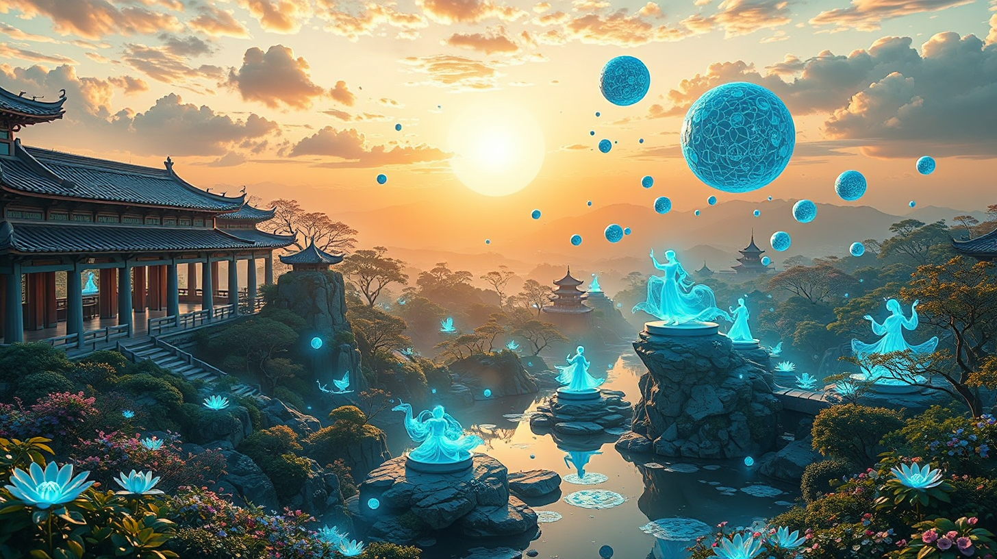 作图提示词:A breathtaking aerial view of a futuristic Suzhou garden at dawn, featuring nanotech-repaired colonnades emitting rippling light patterns, self-healing Taihu rocks releasing bioluminescent spores, and holographic Kunqu opera performers dancing amidst floating projections, creating a dynamic landscape scroll. The scene blends quantum technology with classical Chinese aesthetics, with vibrant dawn light interacting with the cool blue hues of the spores and holograms. Shot with a wide-angle lens to capture the grandeur, shallow depth of field to highlight the holograms, and soft golden-hour lighting to enhance the ethereal atmosphere.