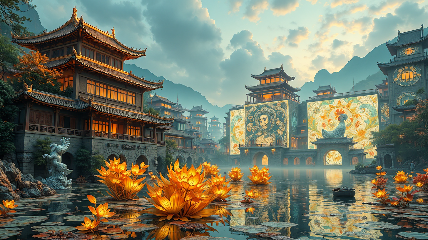 作图提示词:A detailed side-view composition of Golden Chicken Lake, showcasing neural-connected embroidery masters influencing quantum looms in ancient city walls, while fiber-optic aquatic plants rise from the lakebed to transform embroidery patterns into dynamic semantic reliefs on building facades. The scene features intricate details of the changing patterns, with traditional Chinese architectural elements contrasting against futuristic light displays. Framed with a medium telephoto lens for compression, deep depth of field to ensure clarity of both foreground and background, and a mix of warm artificial lights and cool natural tones for visual contrast.