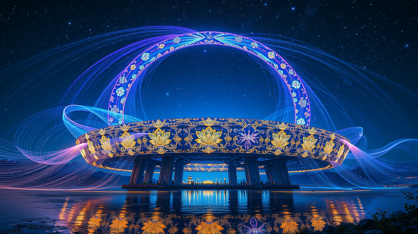 描述:夜幕下的太湖突然被蓝光点亮,刺绣博物馆的纳米丝线如活物般升空,在湖面上方编织出直径千米的星环。环体表面浮现苏绣特有的双面绣纹样,量子纠缠态的粒子在纹路上跳跃,形成流动的金色光网。星环投影在湖面上,将太湖水染成银河,纳米丝线穿梭的轨迹如银针走线,在夜空中绣出量子物理与传统工艺的共生图腾,古老的刺绣技艺在此刻成为观测宇宙奥秘的媒介。