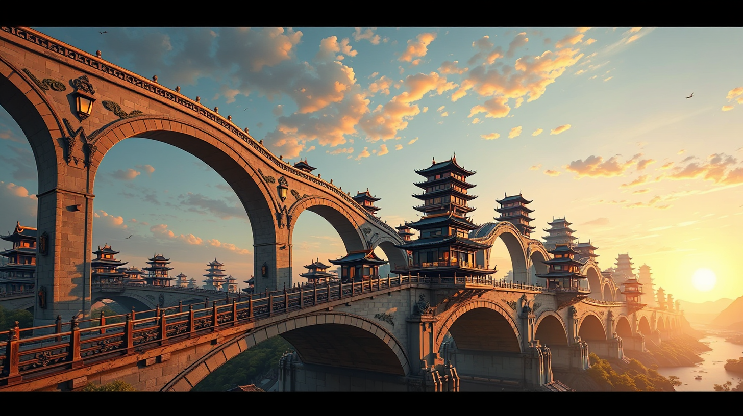 作图提示词:A sweeping side-view panorama showing fifty-three ancient bridges with activated anti-gravity modules forming a three-dimensional community, with magnetic levitation tea houses moving between bridge arches hosting cross-dimensional Kunqu workshops. The composition emphasizes the graceful movement of the bridges and tea houses against a sunset sky, blending traditional Chinese architecture with futuristic floating structures. Captured with a panoramic aspect ratio, golden-hour lighting to enhance the warm tones of the bridges, and a long exposure to create motion blur on the moving tea houses, adding a sense of dynamic energy.
