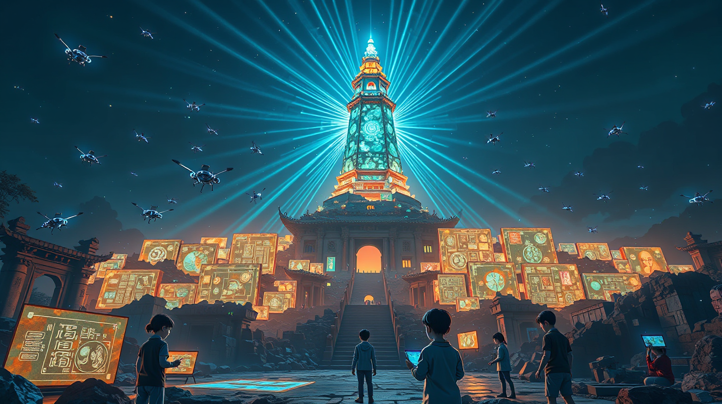 描述:良渚古城遗址的夜空被拓扑数据方舟照亮,无数纳米机器人如蓝色萤火,正将玉琮上的神人兽面纹转化为悬浮的全息密码。遗址中央,玉琮造型的光塔向星空发射文明基因光束,光束中跳动着远古先民的智慧图谱。戴着神经接口的孩子们在遗址间奔跑,他们的思维化作流光,与五千年前的玉器纹样完成跨时空的文明对话。
