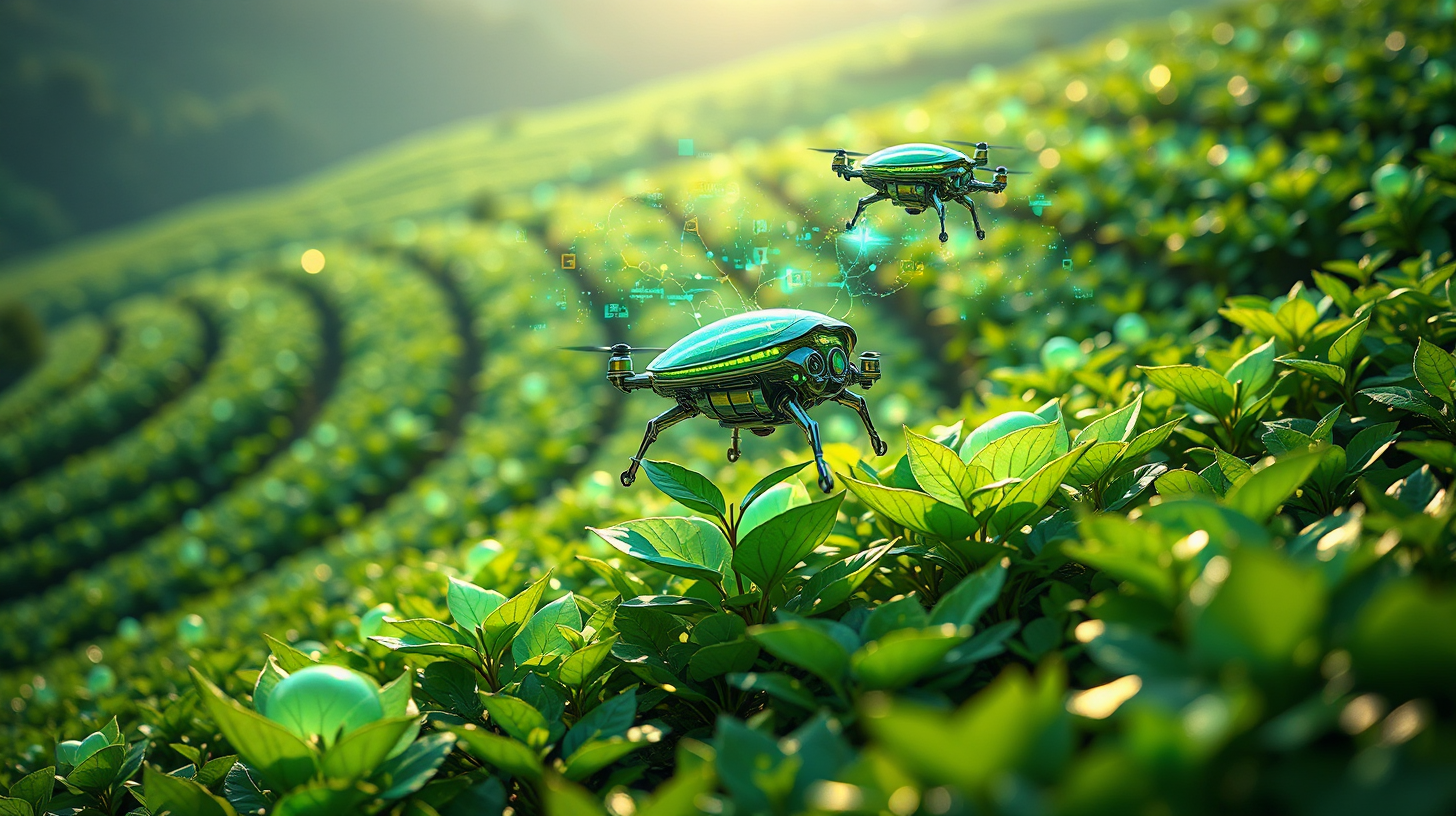 描述:梯田状的立体种植舱如翡翠叠砌,半透明的舱壁内,采茶机器人正以仿生触手与茶树梢头轻触,生物传感器在叶片脉络间亮起幽蓝光点,将茶多酚的量子发酵状态转化为流动的数据流。茶农佩戴的脑机接口泛着微光,他们透过神经链接“品尝”茶叶的生长韵律,指尖划过虚拟界面时,整片茶园的数据流便如银河般在空气中流淌。