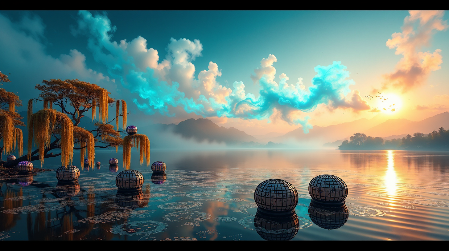 作图提示词:A breathtaking aerial view of West Lake at dawn in 2180, with dynamic nano-light patterns shimmering on the water surface, controlled by AI-driven ecological buoys. Ancient willow branches along the shore project holographic Tang dynasty poetry in flowing calligraphy…