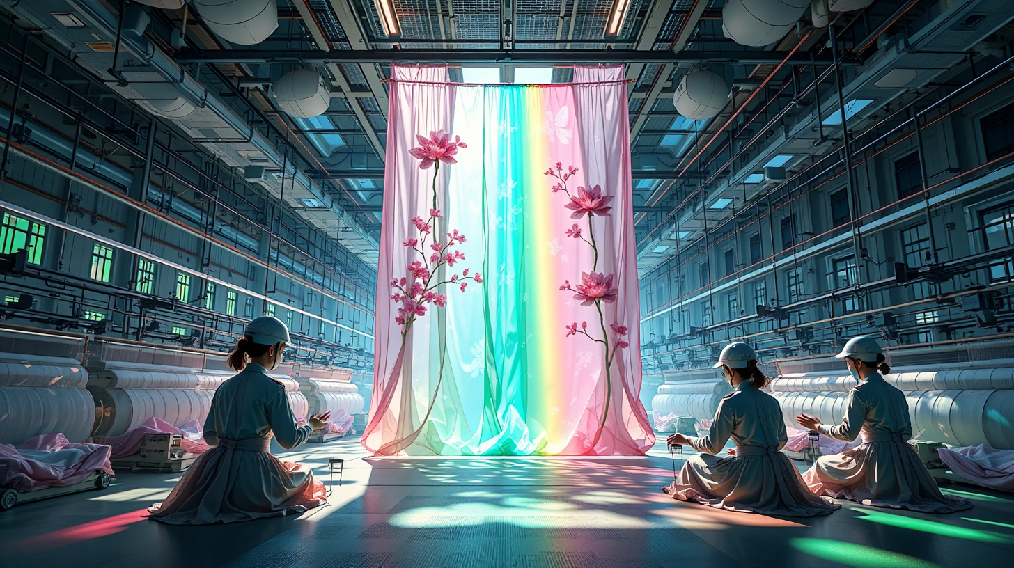描述:悬浮在云端的透明工厂如水晶宫殿,智能织机以纳米级精度将杭州丝绸与光学纤维编织成流动的彩虹。设计师挥手间,全息界面便投射出西湖四季的光影密码:春樱的粉、夏荷的绿、秋桂的金、冬雪的银依次在面料上晕染开来,仿佛将整座西湖的诗意都织进了经纬之中,微风拂过时,面料表面泛起粼粼波光,如湖面被科技之手重新剪裁。