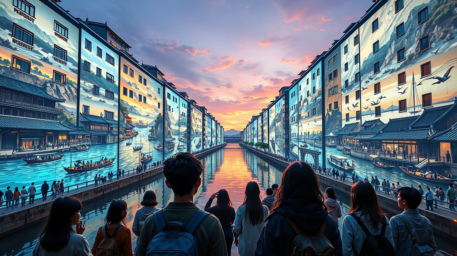 描述:暮色中的京杭运河如一条墨色绸带,两岸明清风格的建筑立面正上演着全息史诗——千年漕运的商船与纤夫在墙面上破浪而行,与此同时,手持思维捕捉器的少年们挥洒创意,他们的涂鸦化作霓虹色的机械鱼,与历史影像中的帆船相互追逐。全息投影的蓝光与夕阳的橙辉在河面交织,形成跨越时空的色彩对话。