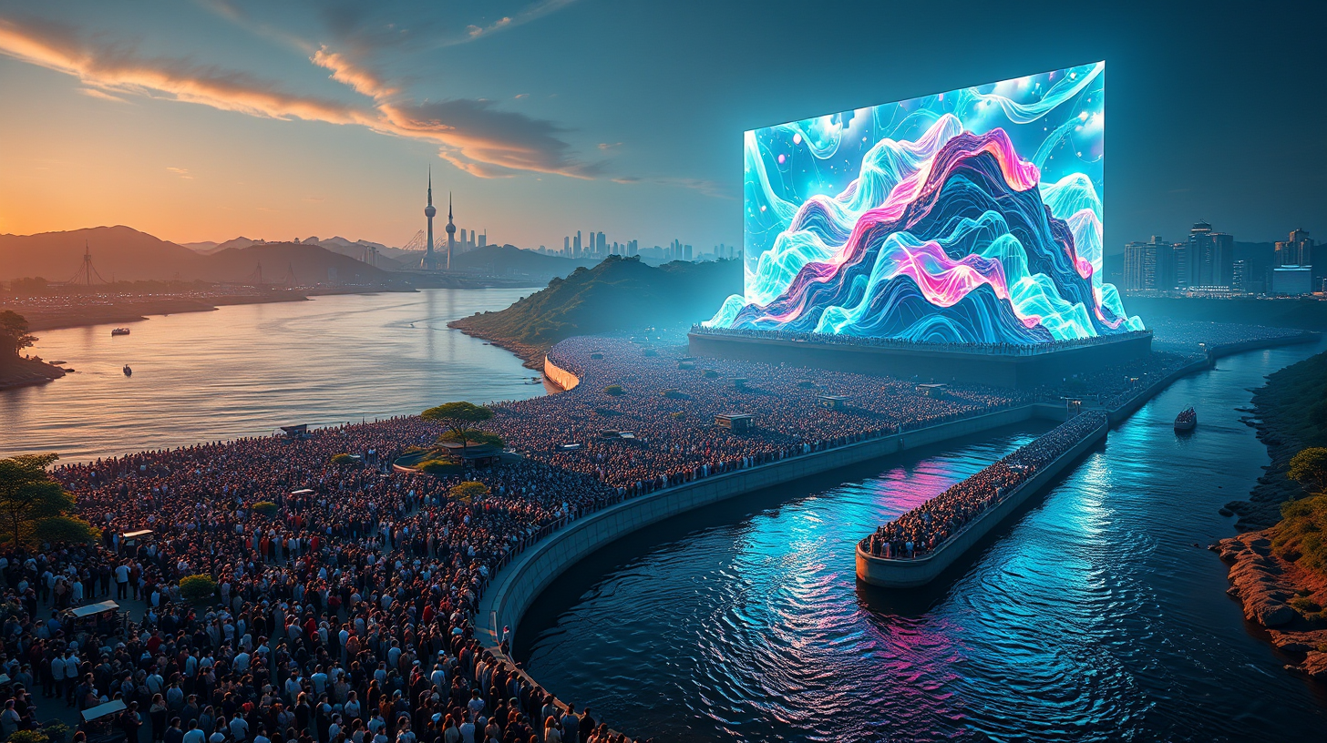 描述:钱塘江大潮如银龙扑岸时,堤坝上佩戴情感共振器的人群发出惊叹,潮水的动能被转化为空中的立体光网。那光网随万人的情绪起伏而变幻:喜悦时绽放玫瑰色的涟漪,敬畏时凝结成冰蓝色的浪柱,人与潮的情感共鸣在科技媒介中化作可见的艺术——夕阳为光网镀上金边,浪潮的轰鸣与电子音效交融,构成未来版的“弄潮儿向涛头立”。