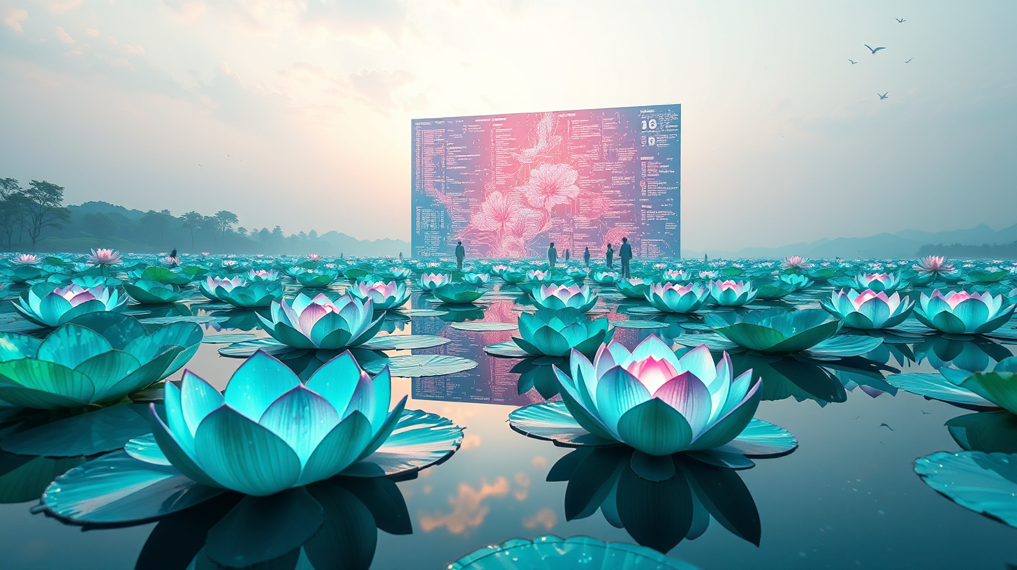 作图提示词:An immersive eye-level shot of programmable lotus flowers on Qujiang Pool, featuring morphing liquid metal petals that reflect real-time ecological data. Visitors interact by tossing data packets that create mesmerizing light ripples across the water surface. The scene suddenly transforms as a giant water screen emerges, displaying秦岭 ecological data streams. The composition balances serene water reflections with dynamic digital displays, using an ethereal blue-green color palette. Biopunk style rendered in ultra-high definition, with careful attention to water surface physics and subsurface scattering effects on the lotus petals.