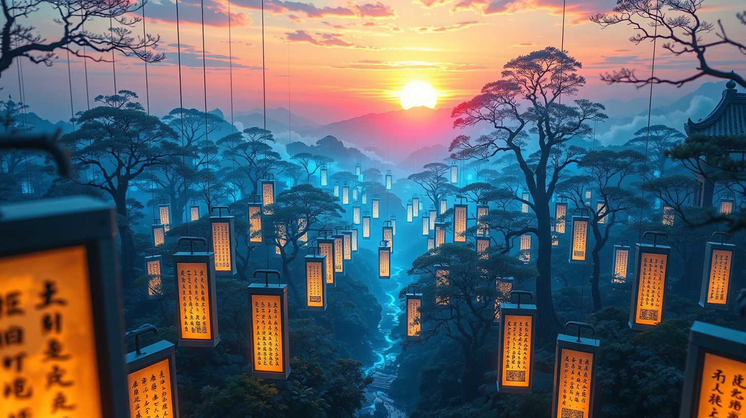 作图提示词:A breathtaking aerial view of quantum stele forest at dawn, featuring suspended electronic steles that project holographic ancient Chinese poetry from various dynasties. The steles emit a soft golden glow, with intricate calligraphy floating ethereally in the air. The scene blends futuristic quantum technology with traditional cultural elements, illuminated by vibrant sunrise colors harmonizing with cool blue quantum energy. Ultra-detailed digital art style with cinematic lighting, depth of field focusing on foreground steles, and warm-cool color contrast.