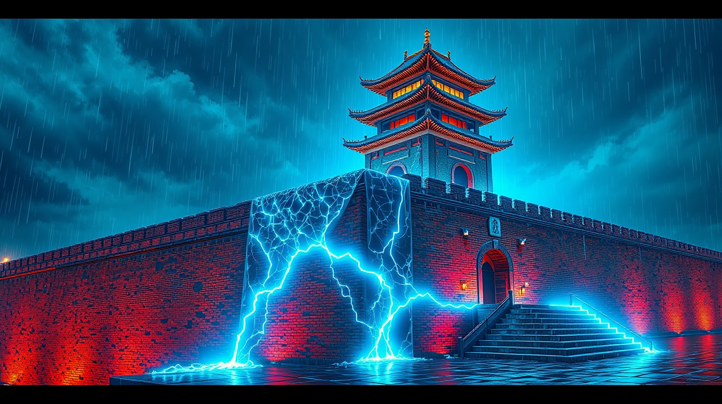 作图提示词:A futuristic ancient city wall in Xi’an, China, with nano-repair gel oozing from the brick seams during a heavy rainstorm. The watchtower unfolds into a three-dimensional protective shield, its surface flowing with energy patterns generated by citizens’ emergency emotional data. Dramatic lighting with glowing blue energy lines, ultra-wide shot from a side angle, vibrant colors of ancient bricks contrasted with futuristic neon blue, mood of awe and technological wonder, photorealistic style.