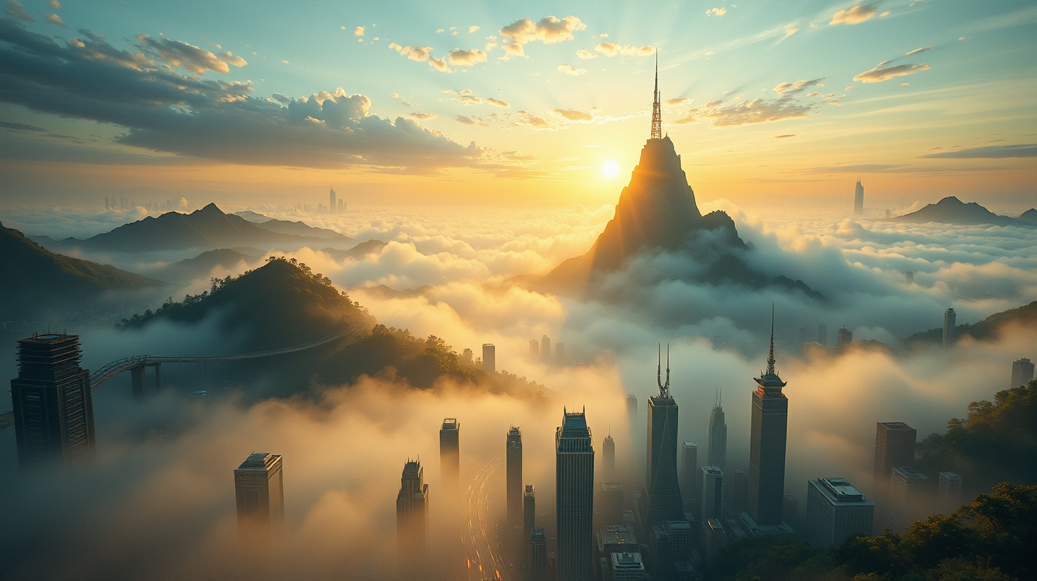 描述:暮色中的终南山脉蒸腾起携带着植物神经信号的智慧雾,如金色溪流般涌入城市。雾气在摩天楼群间穿梭时,自动绘制出动态山水长卷——秦岭松涛化作流动的墨色线条,曲江池影凝结为璀璨的光斑。雾中的量子孢子如萤火虫般飞舞,触碰之处空气污染物化作荧光粒子被吸收。当最后一缕夕阳掠过楼尖,整座城市笼罩在一幅由自然智慧与科技之光共同完成的全息画卷中。