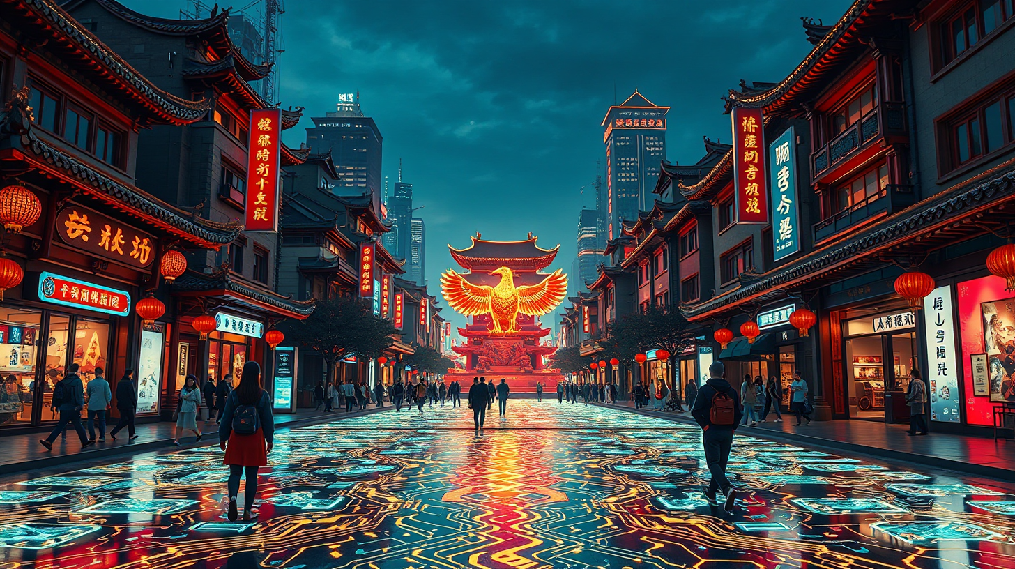 作图提示词:A dynamic medium shot of Zhuque Avenue’s neural-light pavement, where liquid-mercury-like glowing circuit patterns flow dynamically. Pedestrians’ footsteps activate hidden historical holograms, with all light streams converging to form a magnificent vermilion bird totem at the center. Traditional Chinese architectural facades line the street, enhanced with embedded photon displays. The composition features dramatic red and gold energy flows, hyper-realistic details, with rule-of-thirds framing and high dynamic range lighting to emphasize the futuristic cityscape.