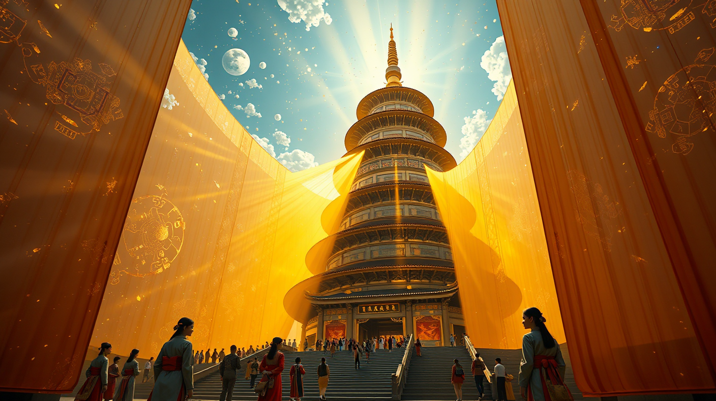 描述:正午阳光直射大雁塔鎏金塔顶,万千金色光粒从琉璃瓦缝隙中喷涌而出,与周边建筑的光子幕墙形成共振涟漪。游客们的汉服配饰突然化作银色神经接口,无数光点在人群指尖汇聚,共同编织出《霓裳羽衣曲》的全息乐舞——琵琶声化作光带缠绕塔身,袖摆挥动间绽放出唐宫夜宴的幻影,佛塔飞檐与量子光束在天穹下构成神圣的共鸣场。