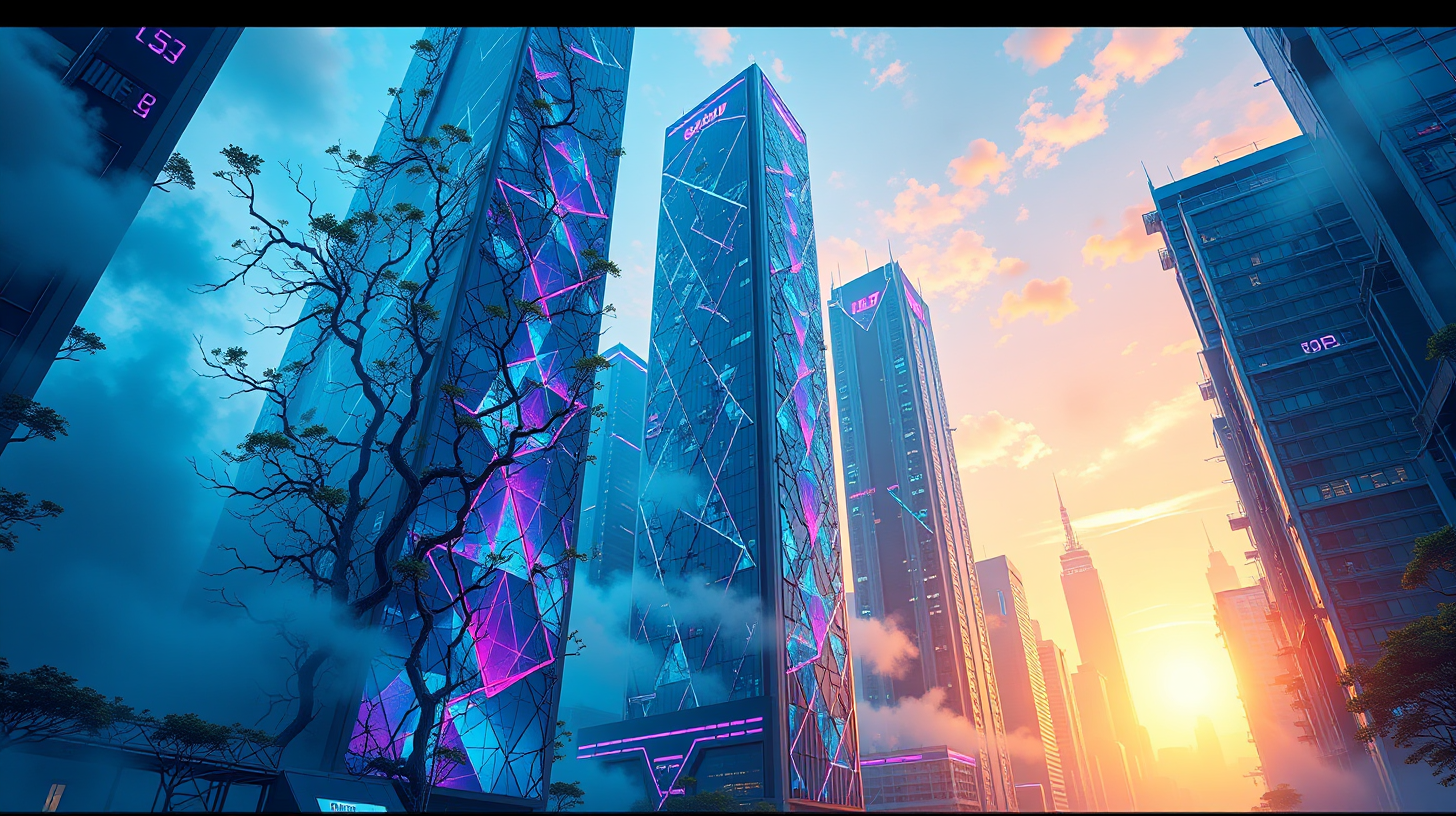 描述:晨曦穿透量子藤蔓的晶体结构,在科技园区建筑立面折射出流动的光谱。藤蔓如生物电缆般自动舒展,形成复杂的光合充电网络,晨光与建筑霓虹轮廓交织,勾勒出棱镜般的光影秀。薄雾缠绕发光藤蔓,似数字时代的晨露,每道光束都在书写新的能量公式,伴随机体生长的细微晶体振动声,奏响未来都市的晨曲。