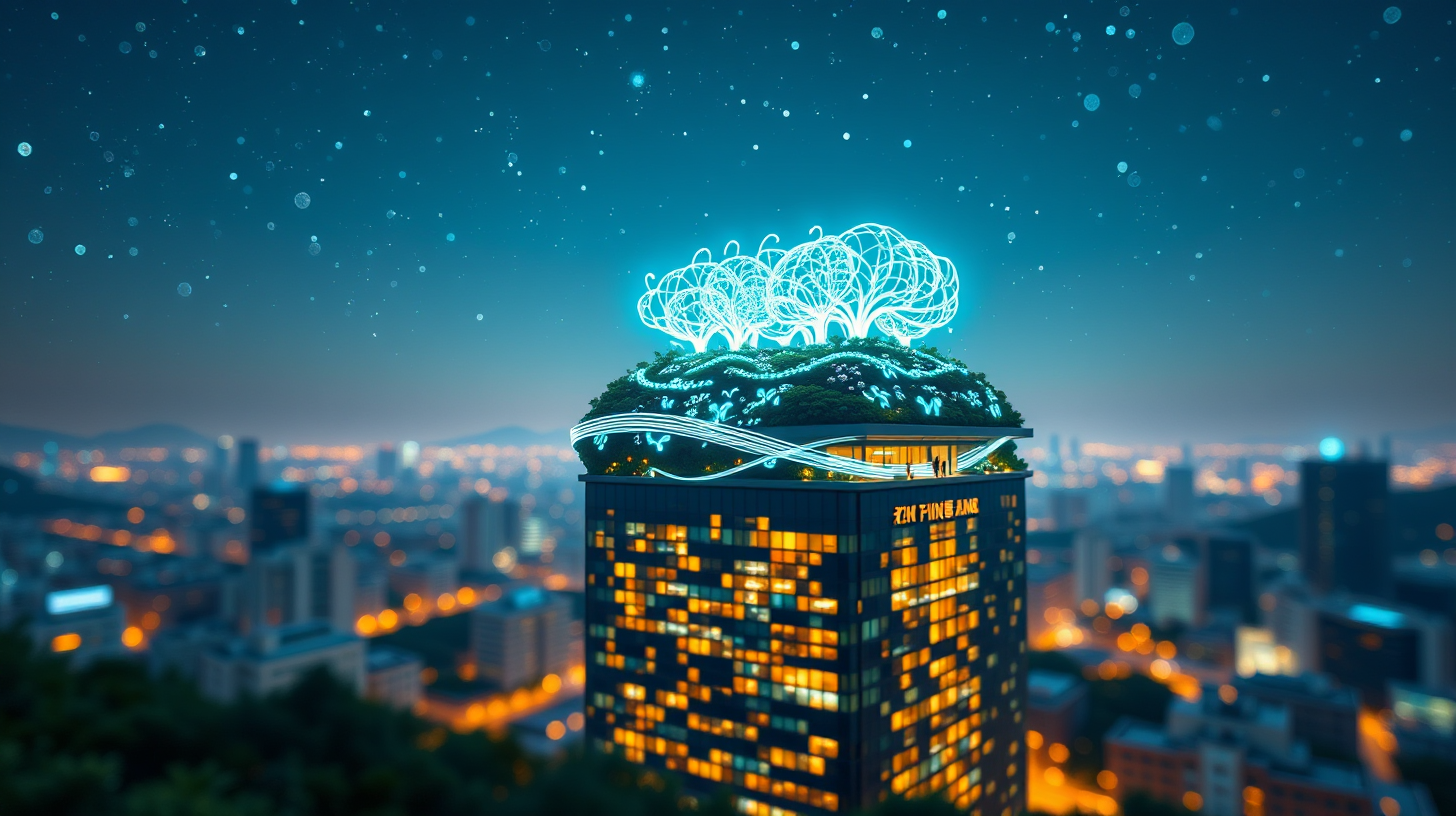 作图提示词:A cutting-edge neural garden atop the quantum-enhanced Ping An Finance Center in 2045 Shenzhen, where millions of citizens’ brainwaves generate intricate bioluminescent patterns. Shot with a wide-angle lens from ground level to emphasize vertical scale, using long exposure to capture dynamic light trails. The composition follows the rule of thirds with the garden occupying the upper two-thirds against a starry sky. Ethereal cold-white and cyan lighting contrasts with warm amber city lights below, creating depth through bokeh effects. The scene conveys transcendent serenity through balanced negative space and smooth motion blur.