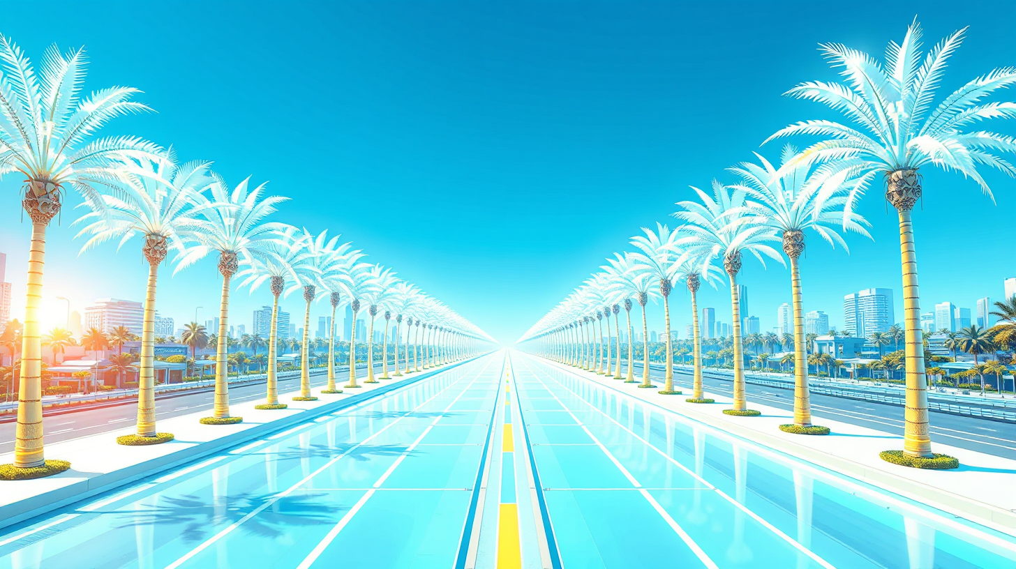 作图提示词:A futuristic midday view of Shennan Boulevard transformed into a river of flowing light, flanked by holographic palm trees displaying real-time multilingual translations. The photonic roadway pulses with data streams while translucent palm fronds project shimmering text in Mandarin, English and Arabic. Clean cyber-futurism aesthetic with white and gold color scheme. Symmetrical composition showing the endless urban corridor vanishing into the horizon. Precise holographic details with subtle chromatic aberration effects. High-tech urban landscape under clear blue skies with lens flare accents.