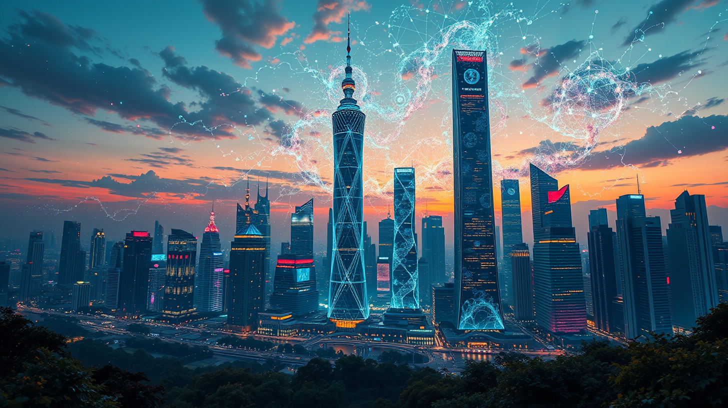作图提示词:A futuristic Shanghai skyline at dusk, with towering skyscrapers covered in dynamic light patterns that transform financial data streams into mesmerizing visual displays. From an aerial garden perspective, the entire sky bursts into quantum light fractals, symbolizing data flow. The scene is illuminated by the warm glow of sunset and the cool hues of the digital light show, creating a breathtaking contrast between nature and technology, with a focus on cinematic wide-angle composition, deep depth of field to capture both the skyline and light details, and a color palette blending warm oranges with futuristic blues and purples.