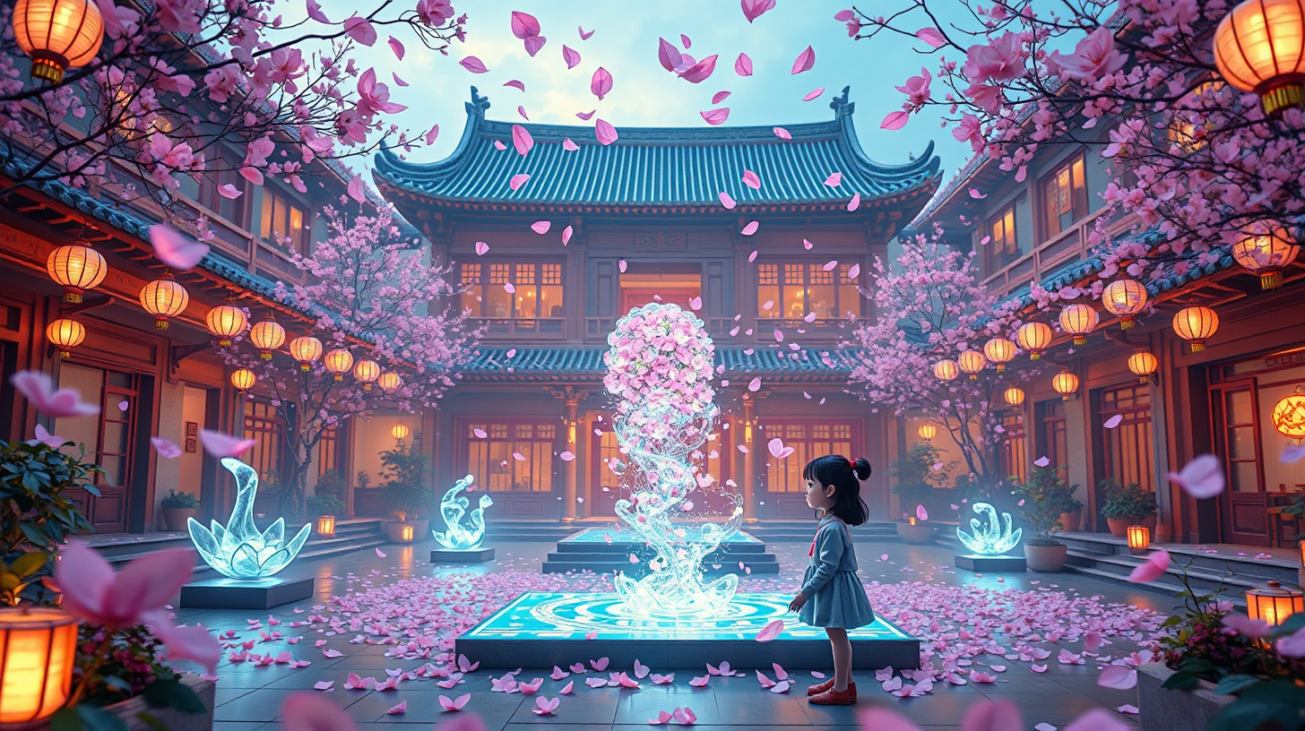 作图提示词:A futuristic reinterpretation of a Shanghai shikumen complex with a central courtyard, where an advanced emotional resonance installation projects collective feelings into three-dimensional light sculptures. In the foreground, a young girl interacts with a holographic interface, her emotions triggering responsive bioluminescent petals that float and form intricate patterns in the air. The scene is bathed in soft pink and gold light from ambient neo-lanterns, with a shallow depth of field focusing on the girl and petals, using diffused lighting to enhance the magical atmosphere, and a color scheme blending traditional warm tones with futuristic pastel accents.