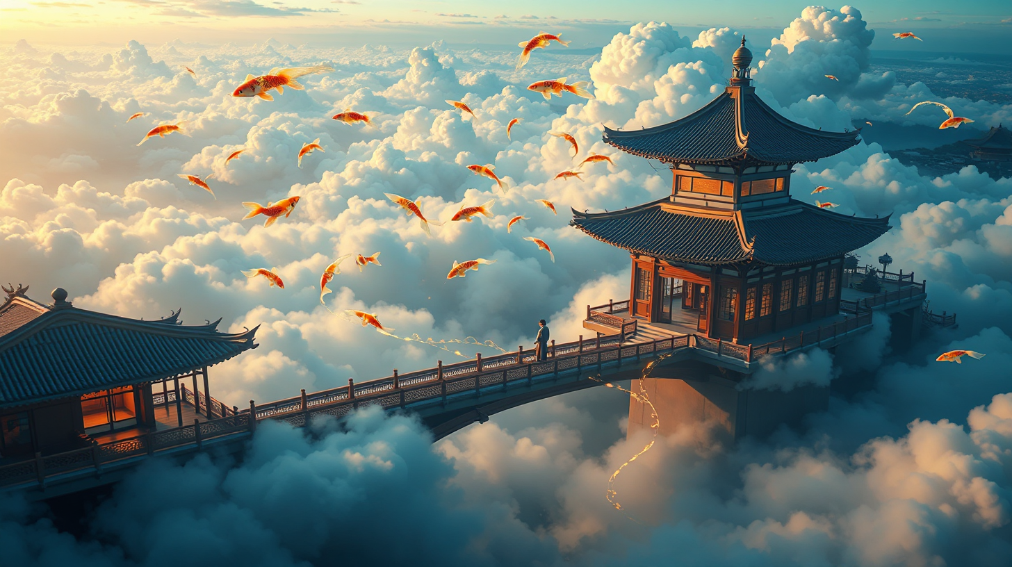 作图提示词:A mesmerizing scene above Yu Garden’s Nine-Turn Bridge where anti-gravity tea rooms float amidst clouds, with mechanical koi fish swimming through the air leaving glowing ink trails. An AI tea master performs a zero-gravity ceremony using magnetic levitation tea sets. Shot from a high angle with a tilt-shift lens to enhance the floating perspective, capturing the intricate movements in rich dreamy colors (deep blues and golds) with balanced ambient and artificial lighting to create serene volumetric lighting effects, rendered in a surreal neo-futurism style with smooth motion blur on the koi trails.