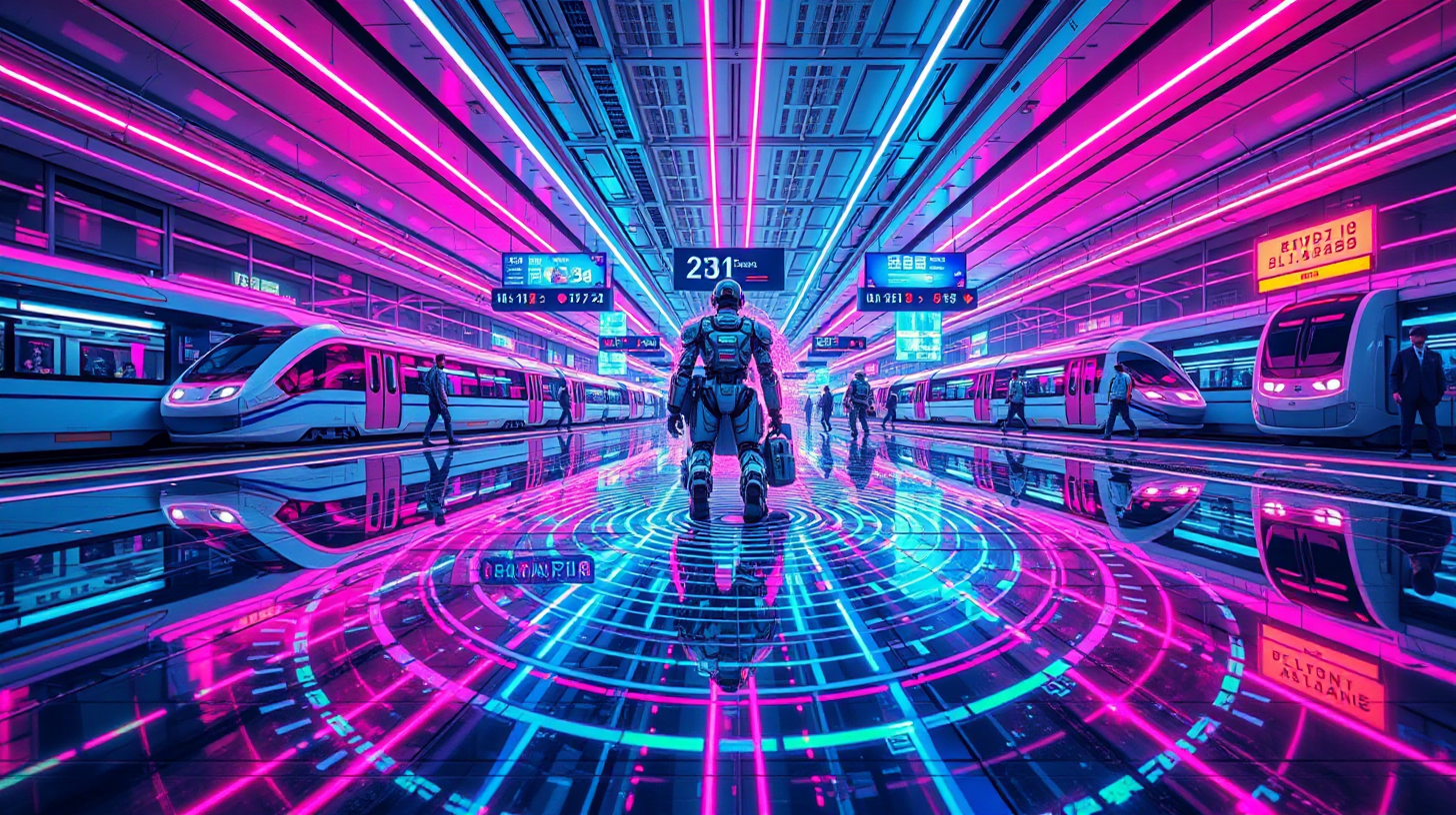 作图提示词:A dynamic futuristic scene at a transportation hub where smart perception glass floors generate rainbow ripples as high-speed trains arrive, while cleaning robots rearrange to project real-time schedules with laser beams. Captured at eye level with a wide-angle lens (24mm) to emphasize both ground patterns and aerial displays, using vibrant neon pinks and blues in high-contrast lighting with crisp reflections on the glass surface, rendered in a high-tech cybernetic style with precise geometric compositions and chromatic aberration effects for technological authenticity.