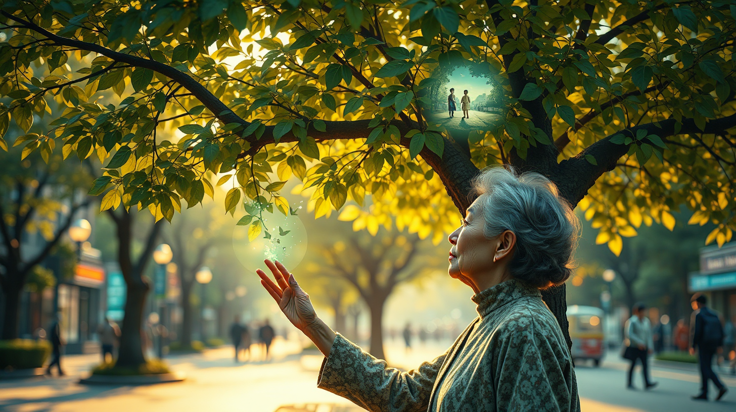 作图提示词:A serene and nostalgic scene on Nanjing Road where the plane trees have been upgraded into biostorage terminals, their leaves shimmering with flowing light that displays warm memories uploaded by citizens. An elderly woman gently touches a tree trunk, triggering a holographic projection of her 1940s childhood among the leaves. Captured at eye level with a medium telephoto lens (85mm) to compress perspective and isolate the tender moment, using soft golden hour lighting with warm golden hues and gentle greens in a shallow depth of field (f/2.8) to create emotional focus, rendered in a nostalgic cinematic style with subtle film grain.