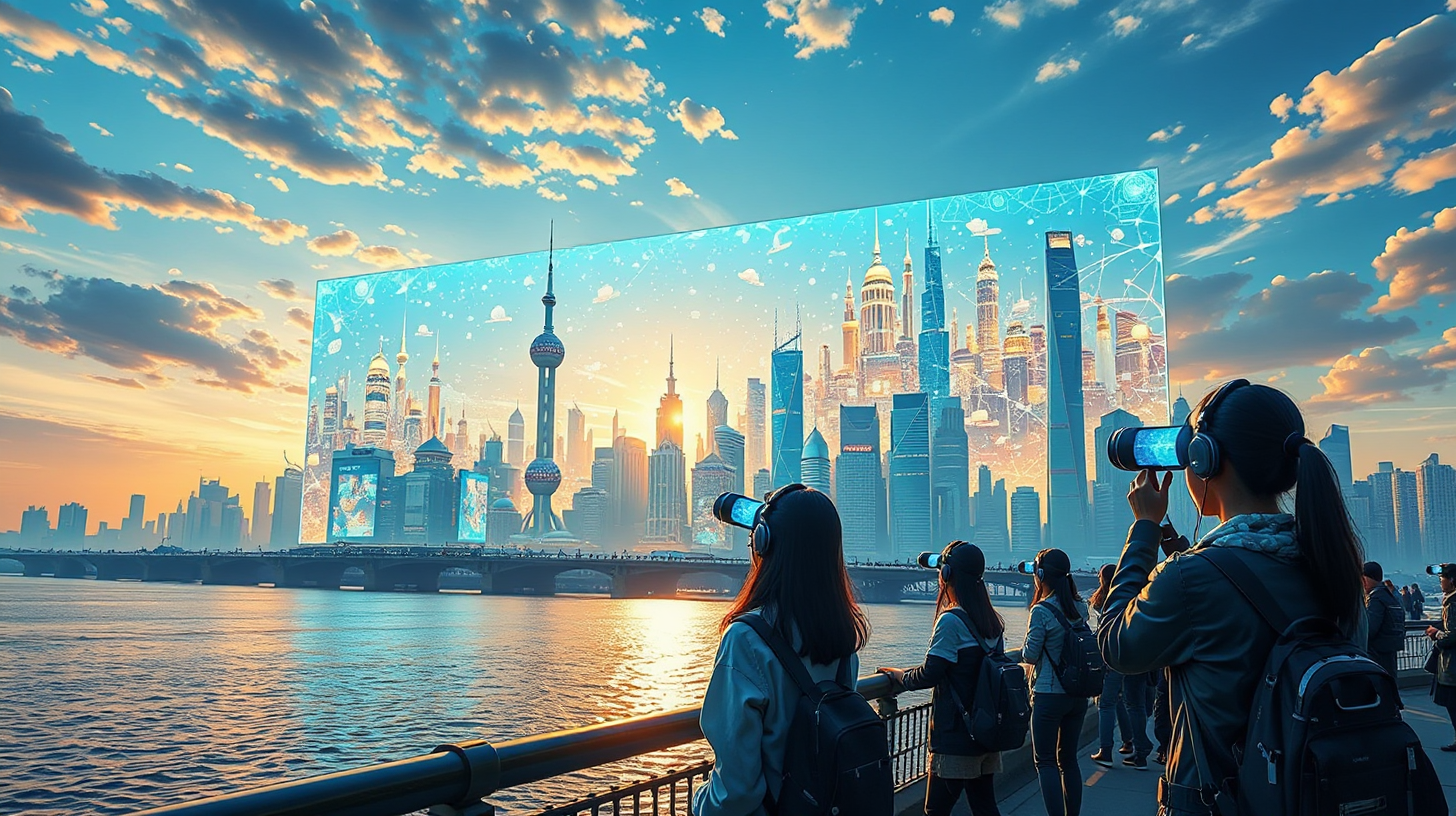 描述:晨曦为黄浦江镀上一层金辉,亿万纳米机器人组成的动态光幕悬浮上空,如流动的绸缎般投影出上海百年建筑群的量子态演变史。不同时空的外滩在光幕中同时闪烁,游客们手持神经接口望远镜,目光被这跨越时光的奇观牢牢吸引,仿佛能触摸到历史与未来的脉搏在此交织。