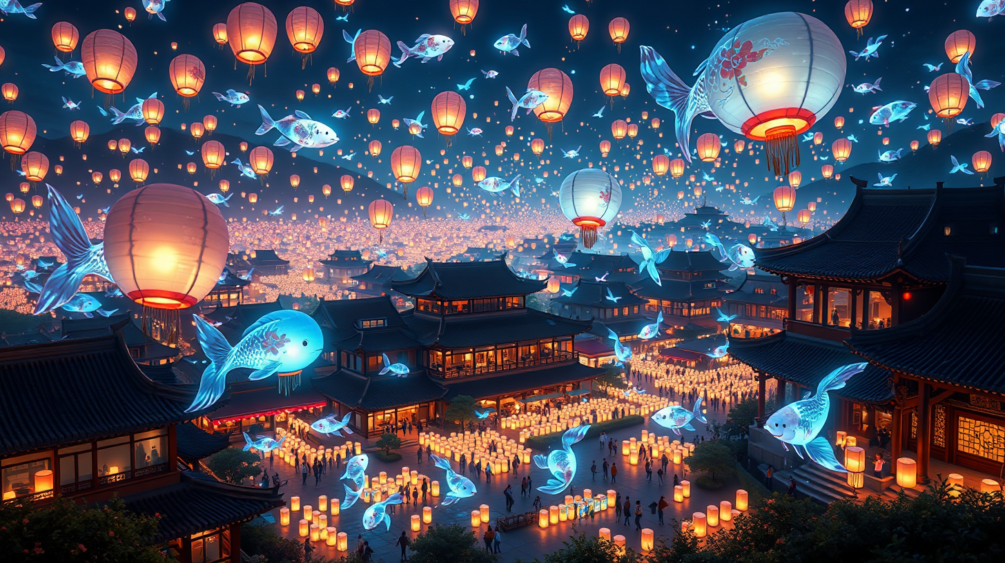作图提示词:A nocturnal panorama of Lingnan Tiandi illuminated by thousands of floating smart lanterns. Each lantern emits bioluminescent hues that shift according to nearby emotional frequencies, creating a living color spectrum. Some lanterns transform into holographic koi fish when approached, their light tails leaving temporary afterimages. Traditional architectural elements glow with subtle edge lighting, while projected Cantonese opera motifs interact with children’s light drawings in the air. Shot from an elevated vantage point using a wide aperture to create bokeh effects from the countless light sources, with careful attention to preserving shadow details in the historic buildings.