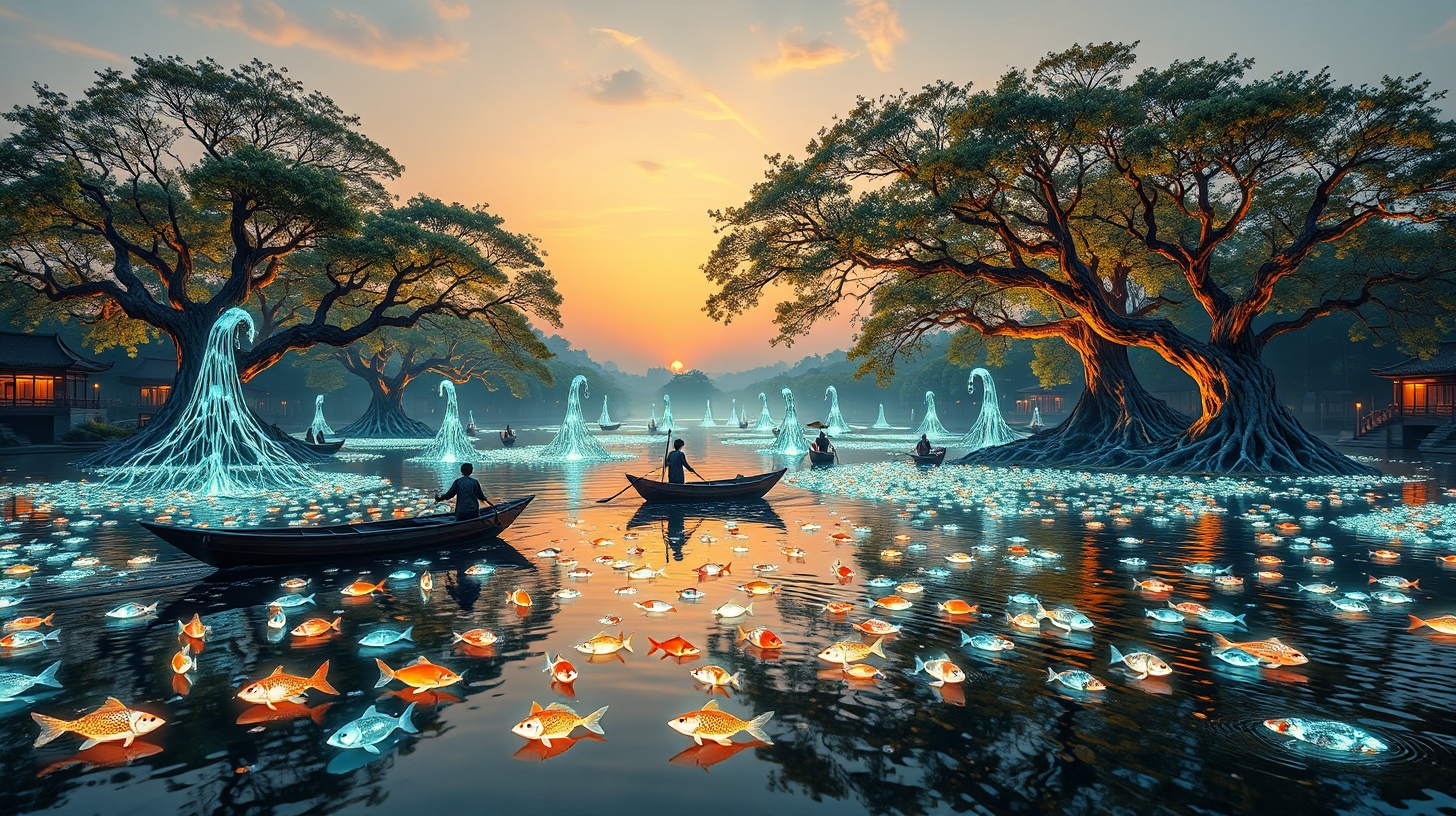 作图提示词:A serene golden hour scene at Fengjian Waterway featuring dynamic holographic mulberry-dyke fishpond projections shimmering on the water surface, with photonic fish schools erupting in sparkling particle effects where boat oars touch. Ancient banyan trees with pulsating data roots dipping into the river, their glow reflecting on traditional Cantonese boats gliding through the hi-tech water. Captured with a medium telephoto lens for compressed perspective, using long exposure for smooth water surfaces mixed with crisp holograms, ethereal glow lighting with complementary orange-blue color grading, and careful attention to reflection symmetry between real and projected elements.