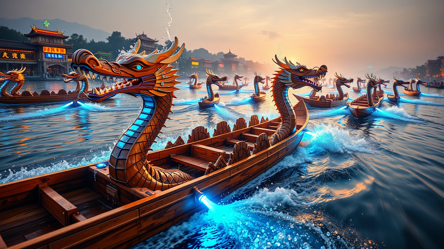 作图提示词:A dynamic Dragon Boat Festival race on Dongping River, featuring traditional wooden dragon boats enhanced with sleek anti-gravity propulsion systems, creating glowing ion trails in the water. The boats’ polished teak surfaces contrast with blue energy emissions from their engines. Low-angle perspective emphasizing speed with water spray crystallization in mid-air. Morning golden hour lighting enhances the warm wood tones against cool tech accents. Ultra-wide composition showing multiple boats with their light trails forming geometric patterns across the river’s surface.