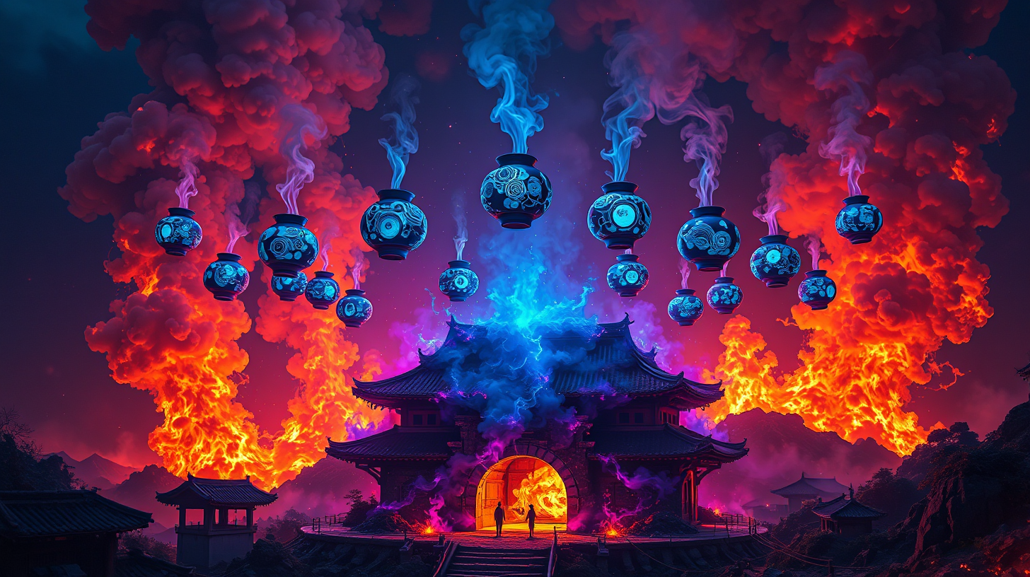 作图提示词:A breathtaking aerial drone shot of Nanfeng Ancient Kiln erupting with vibrant quantum flames in hues of blue and purple, intelligent ceramic vessels floating in precise constellation formation above the dragon kiln, their surfaces displaying intricate glowing energy circuits. The scene features ultra-high detail with 16-bit color depth, showing swirling particles of light and heat distortion effects. Using a wide-angle lens to capture the full scale, with balanced rule-of-thirds composition, high dynamic range lighting to preserve details in both flames and ceramics, and a slight tilt-shift effect to emphasize the floating vessels against the traditional kiln structure.