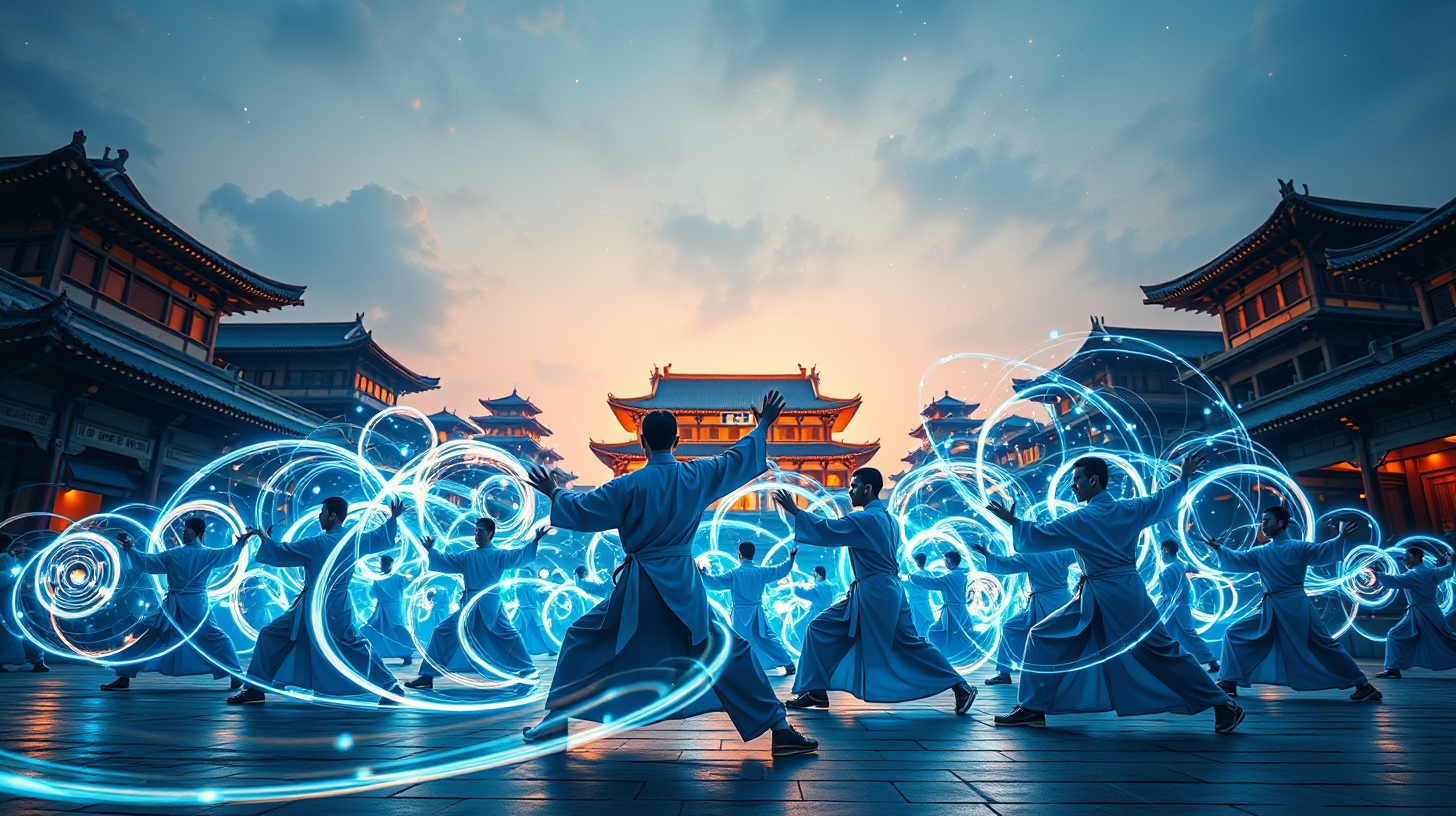 作图提示词:A dynamic low-angle shot of Tai Chi masters practicing in Liangyuan Square at dusk, their fluid movements generating visible gravitational force fields that subtly warp and align surrounding traditional architecture into glowing energy arrays. Motion trails form intricate luminous martial arts databases in the air, with particles suspended in the energy fields. Shot with a wide aperture for shallow depth of field focusing on the nearest master, using high-speed sync flash to freeze motion while capturing light trails, dramatic perspective distortion to emphasize the energy patterns, and a cool-warm color contrast between the blue energy fields and golden traditional buildings.