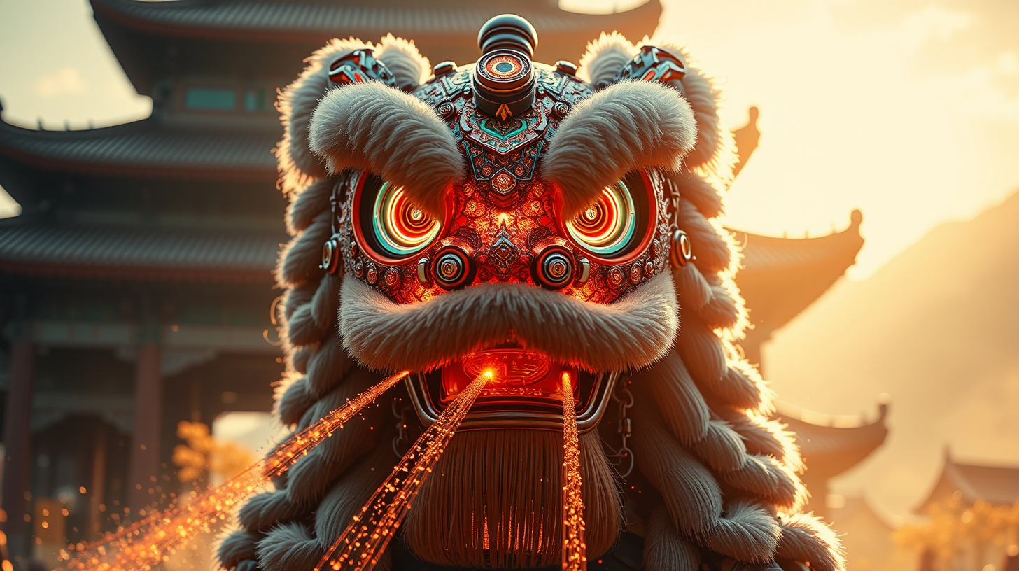 作图提示词:A cyberpunk-style lion dance performance at dawn in Foshan Ancestral Temple, the traditional lion head intricately adorned with shimmering nano-mechanical scales, its eyes emitting dynamic streams of glowing data particles, bathed in golden morning light with volumetric rays. Ultra-detailed 8K resolution, blending Chinese cultural heritage with advanced quantum technology, using a medium close-up shot with shallow depth of field to highlight the lion’s face, cinematic composition with dramatic chiaroscuro lighting and warm color grading to emphasize the contrast between tradition and futurism.