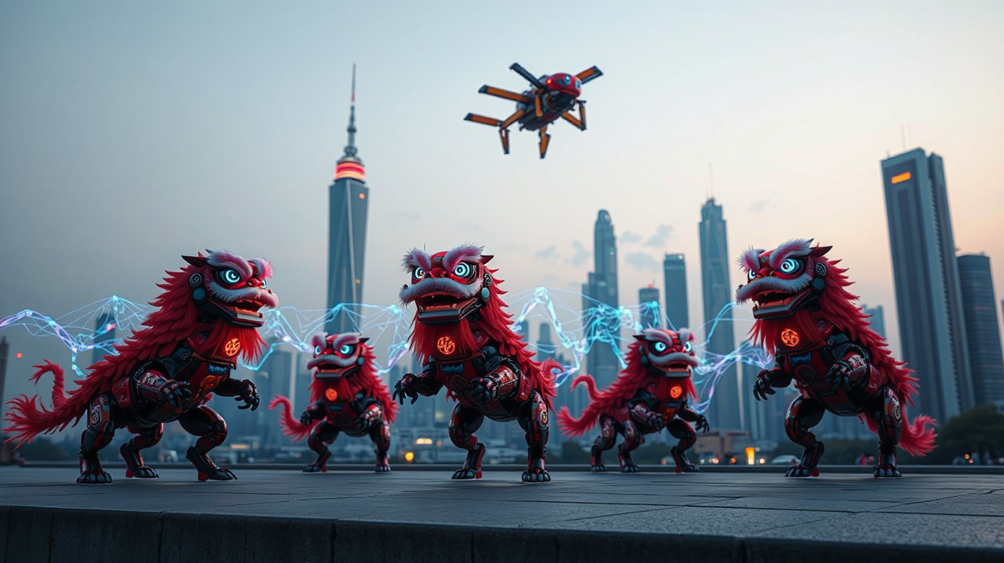 作图提示词:An aerial formation of urban construction mechs transformed into robotic lion dance performers, their articulated bodies executing traditional dance movements while emitting holographic trails that form a dynamic city solution map, low-angle shot against Guangzhou’s futuristic skyline at dusk, mechanical lions adorned with glowing traditional patterns, high-speed motion capture with motion blur and lens flare effects, fusion of crimson lion dance aesthetics with polished mecha details under dramatic spot lighting.