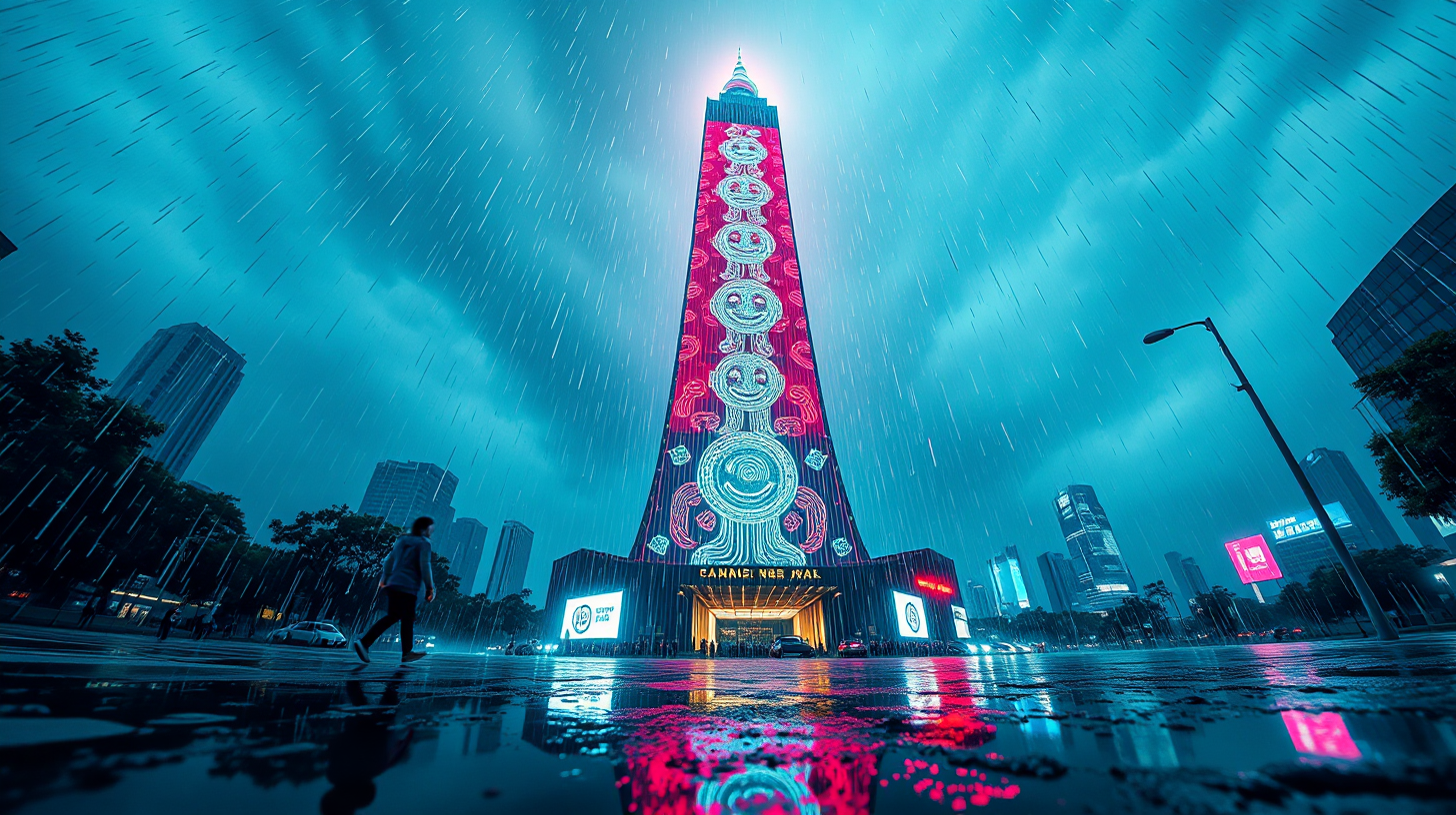 作图提示词:A dramatic wide-angle shot of Guangzhou’s Canton Tower during a torrential downpour, capturing the moment its apex unfolds into a massive plasma screen displaying protective animations generated from citizens’ biometric smile data. The composition uses a low-angle perspective to emphasize the tower’s height, with raindrops creating dynamic light patterns on the energy barrier. Ultra-high-definition rendering showcases cinematic rain effects and neon reflections on wet surfaces. Shot at 16mm focal length with deep depth of field (f/11) to keep both foreground puddles and the towering structure in focus. The lighting combines cool blue ambient rain illumination with vibrant cyberpunk neon accents, while motion blur on falling raindrops adds kinetic energy. The color grading emphasizes high contrast between the dark stormy skies and glowing urban elements.