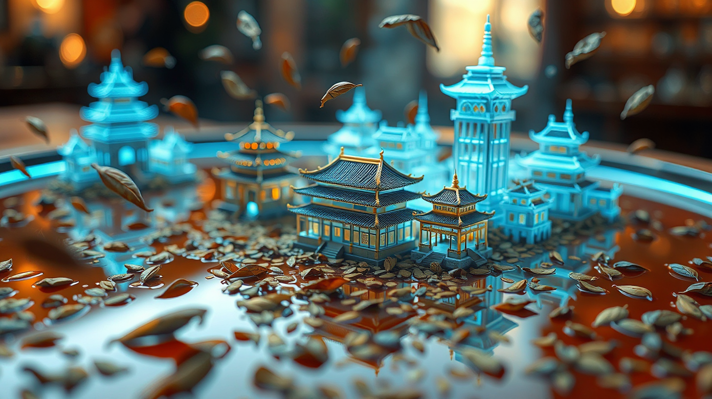 作图提示词:A hyper-detailed close-up of a zero-gravity tea surface in a futuristic Guangzhou teahouse, where nanoscale holographic projections of historic Xiguan architecture emerge from the liquid with intricate golden detailing, surrounded by suspended tea leaves in mid-air. The scene features ultra-high-definition photorealistic textures, volumetric cinematic lighting with soft ambient glow, and a balanced composition blending futuristic technology with nostalgic cultural elements. Shot with a macro lens at f/2.8 to create shallow depth of field, emphasizing the floating tea leaves in the foreground while keeping the holographic buildings sharply in focus. The color palette combines warm amber tones of the tea with cool blue holographic accents, creating visual contrast.