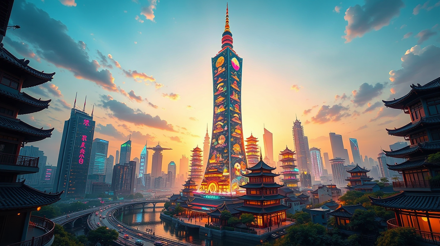 作图提示词:A futuristic Guangzhou cityscape at dawn, the Canton Tower transformed into a quantum spectrum emitter, its surface dynamically projecting holograms of traditional Qilou and Huoer houses, ultra-wide shot from a low angle with dramatic golden sunrise lighting, vibrant neon accents blending with warm hues, cyberpunk aesthetic infused with traditional Chinese architectural motifs, highly detailed digital painting with cinematic depth of field and dynamic contrast.