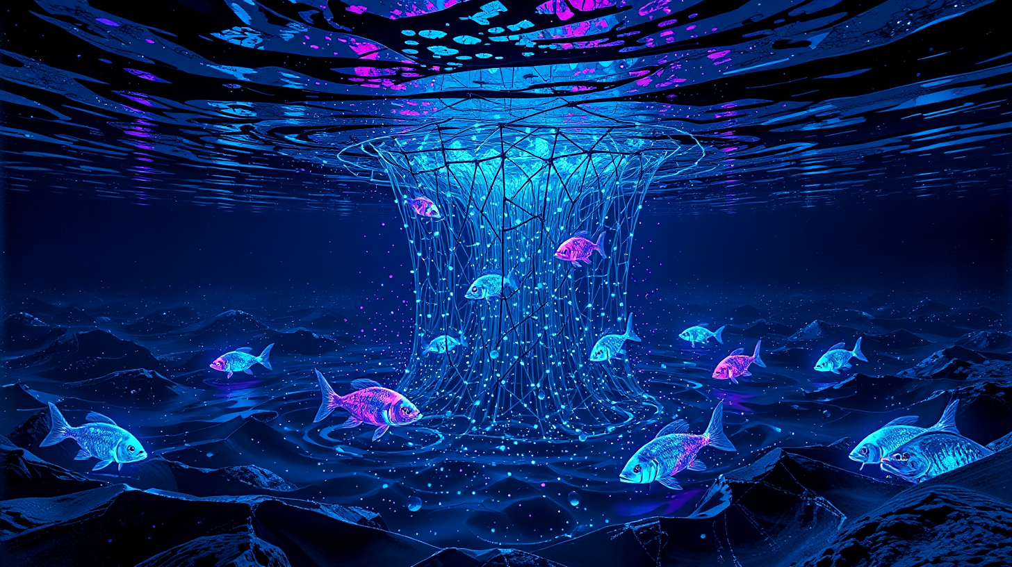 作图提示词:The Pearl River at night, its surface animated with programmable matter forming a geometric fishing net that captures and dissolves glowing quantum fish into energy particles, underwater perspective looking up at the shimmering spectacle, deep indigo waters contrasting with electric purple and cyan bioluminescence, sci-fi illustration style with volumetric lighting and refractive water effects, highly detailed with dynamic particle systems.